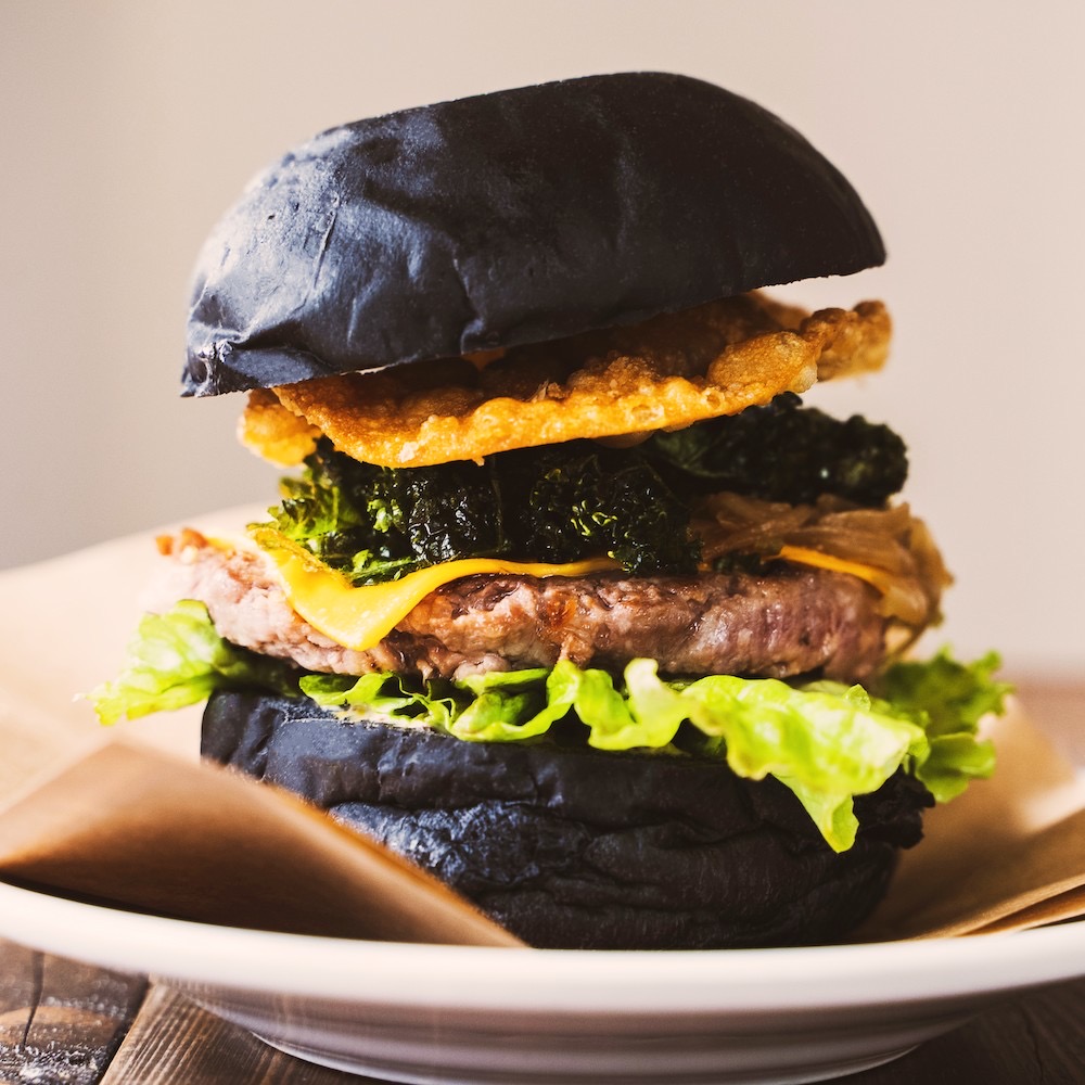 すべてのハンバーガーに黒いバンズと100%ビーフパティを使用。