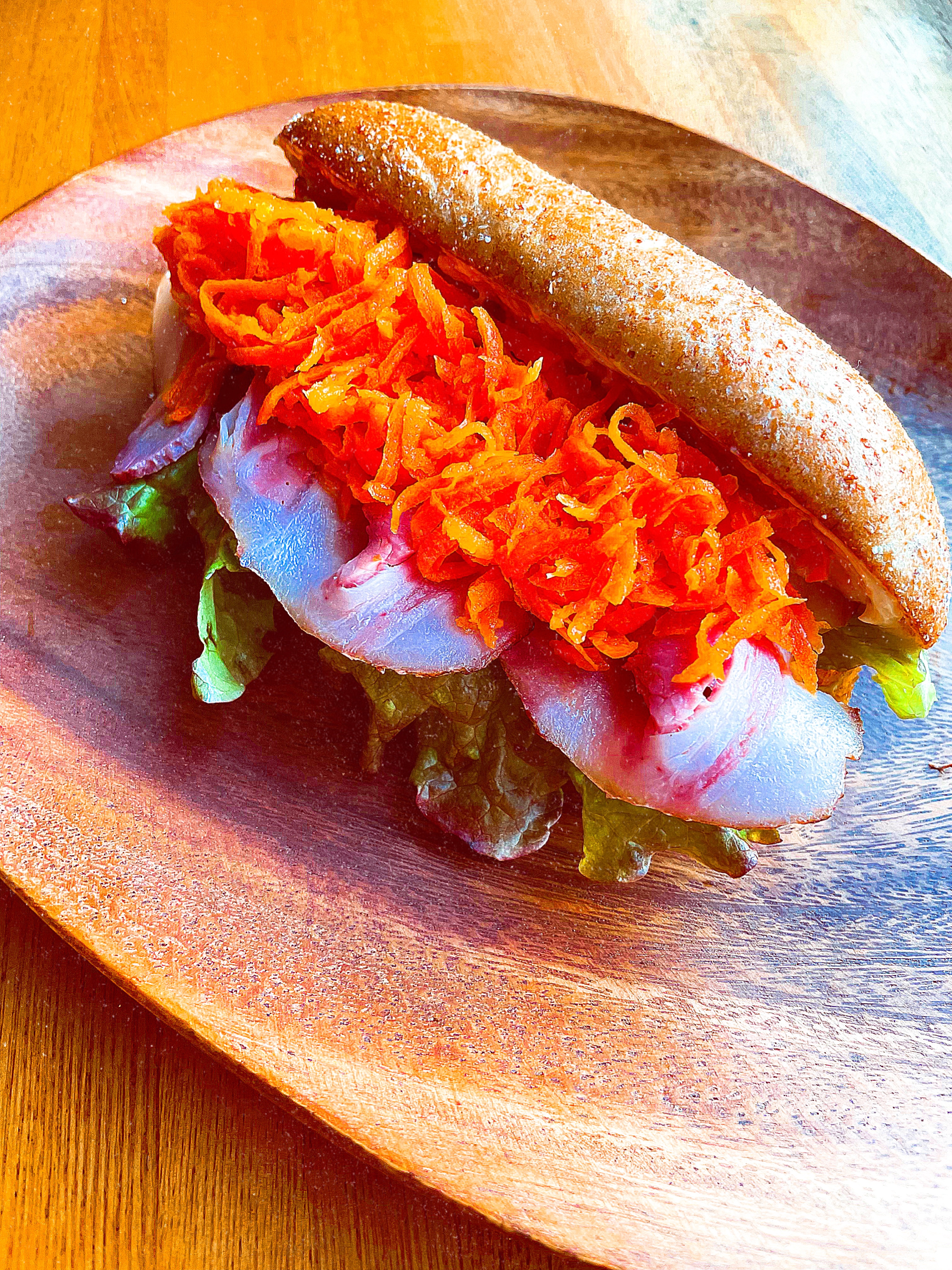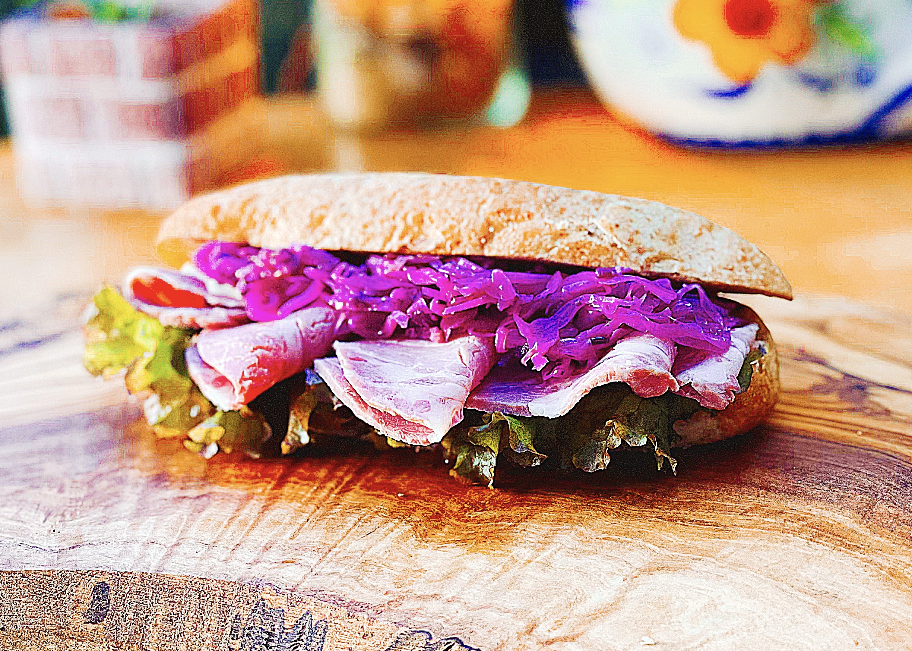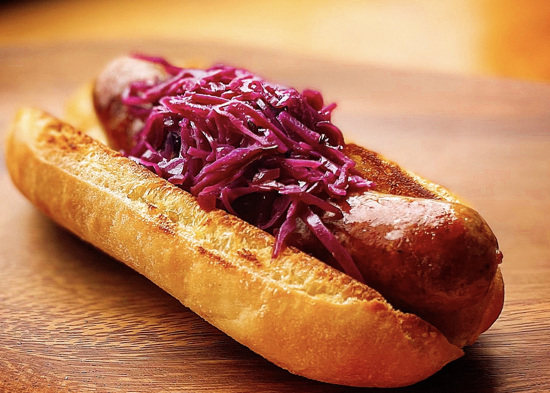 歯切れがよくもっちりした天然酵母パンをフライパンでオリーブオイルでカリッと焼き、2日かけて作るソーセージと紫キャベツのザワークラウトと合わせています。