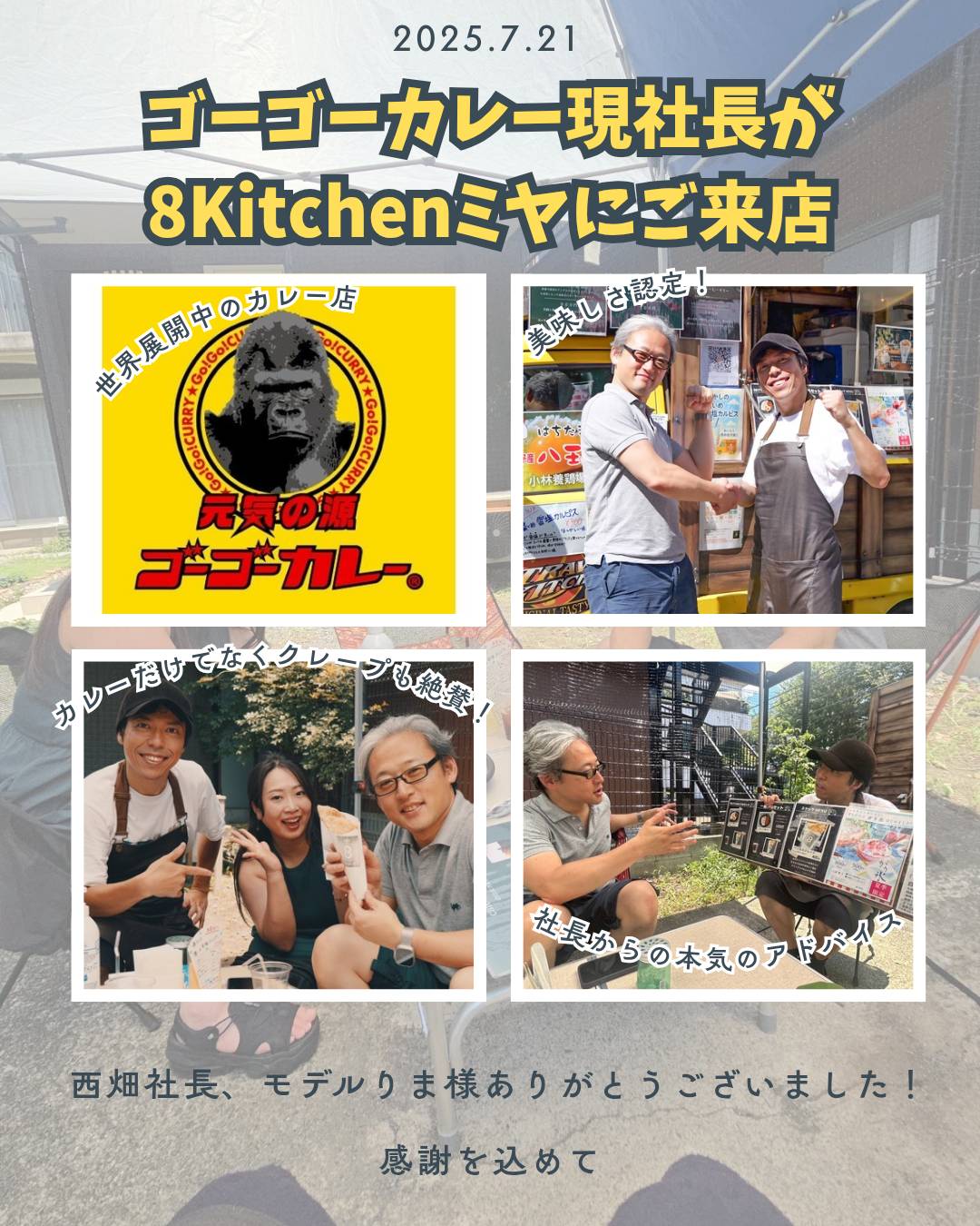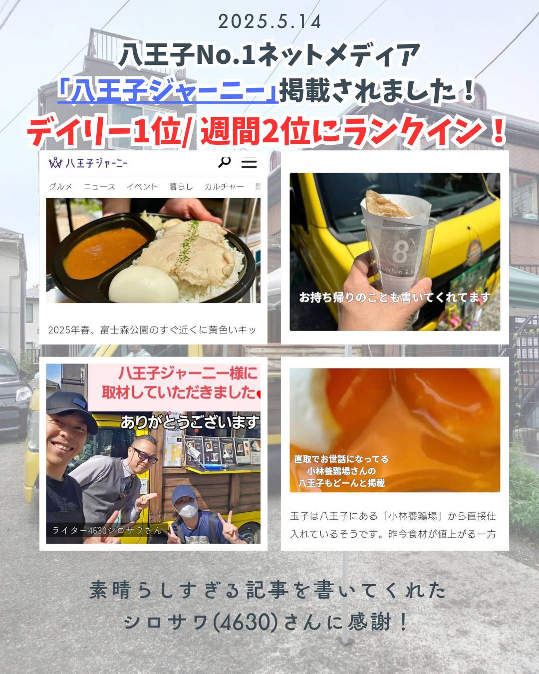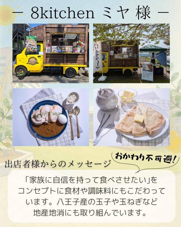 2025年春、八王子の富士森公園すぐ近くに黄色いキ ッチンカー 『8kitchenミヤ』が出現し、あっという間に大きな話題を集めています。 こだわり鶏カレ ーと新食感パリもちクレープが人気で注目を集め、すでに八王子No.1メディア「八王子ジャーニー」に特集されたり、テレビ東京の人気番組「昼めし旅」に出演したり、また人気インフルエンサー、著者、ボディジャパンのグランプリの方など全国各地から多数ご来店いただいてます。「料理は愛情」を大切にする店長が、国産の鶏肉・農家直取引のお米・八王子産のたまねぎや玉子と地産地消にもこだわって一つずつ作るキッチンカーです。