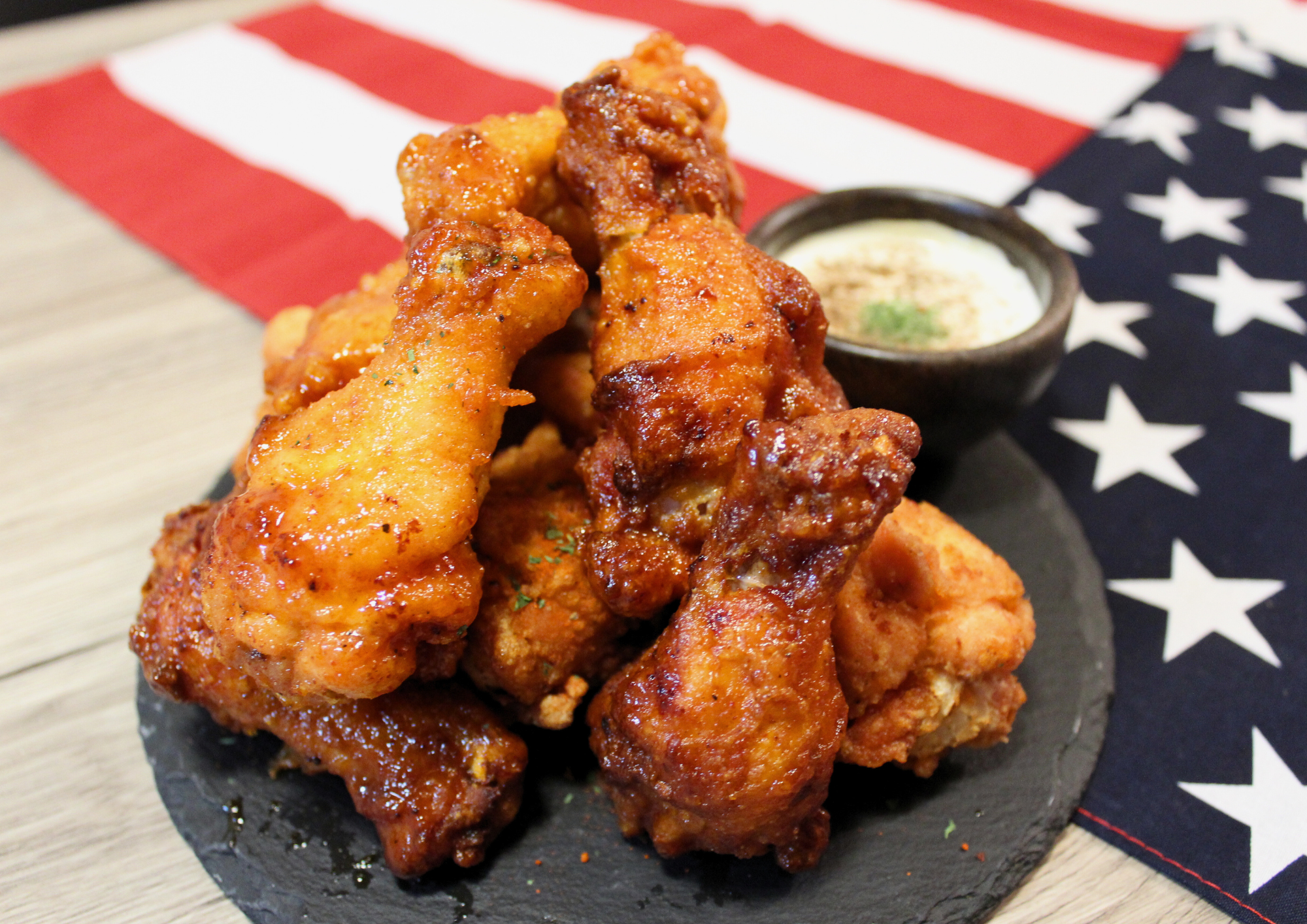 オリジナルスパイスで仕上げるプルドポークやスパイシーなバッファローウィング。