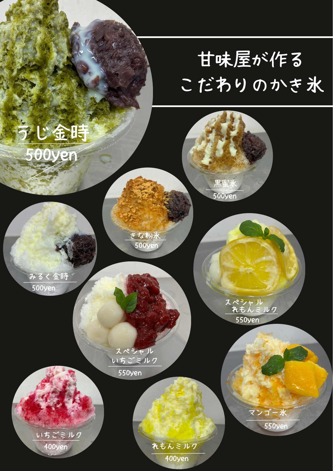 二重焼き、プチお好み焼き、白玉団子、ドリンク、かき氷(夏季のみ)