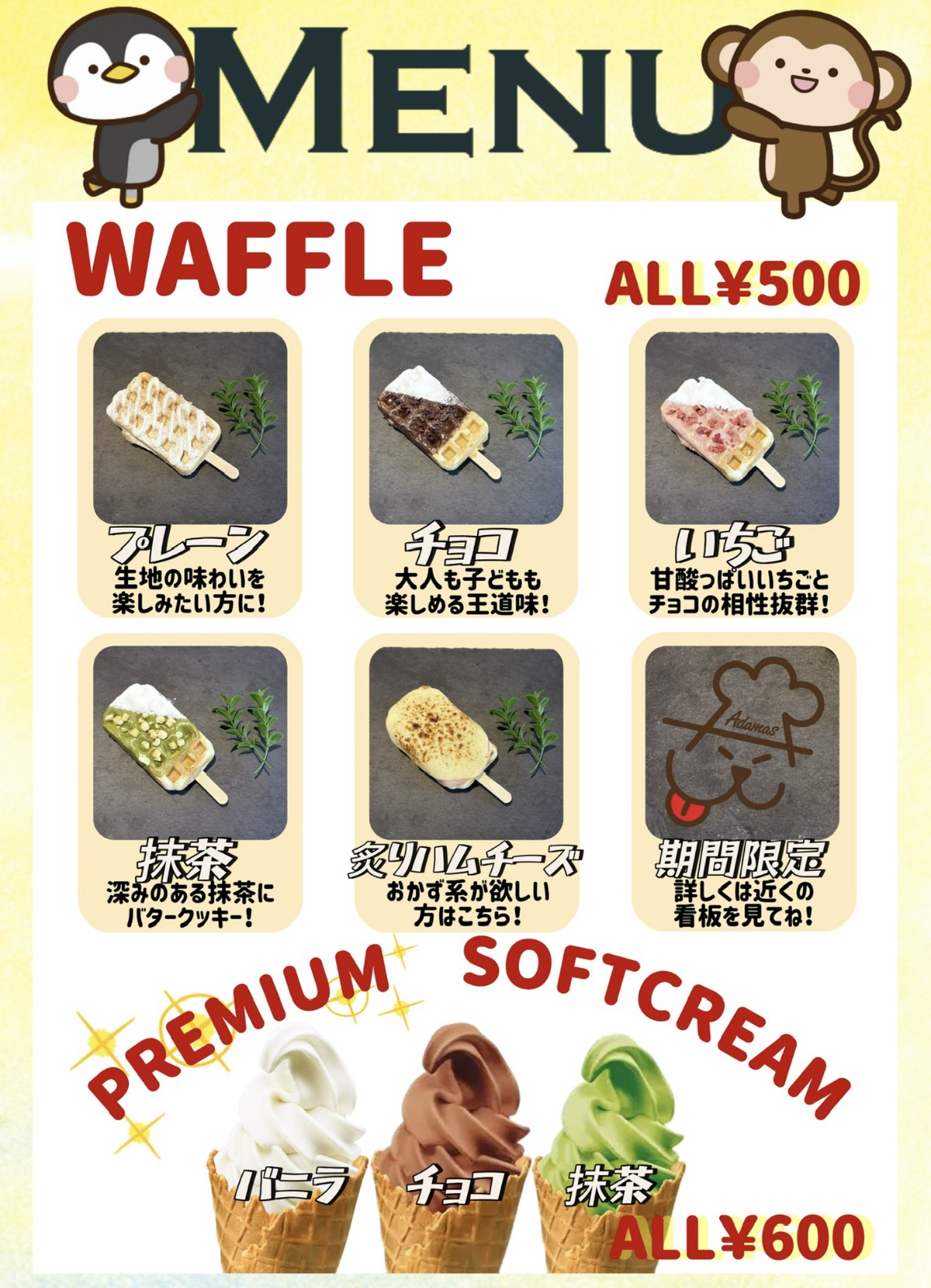 ワッフル各種/500円 プレミアムソフトクリーム各種/600円 出店料は基本的にはいただいておりません!お気軽にホームページからお問い合わせ下さい✨