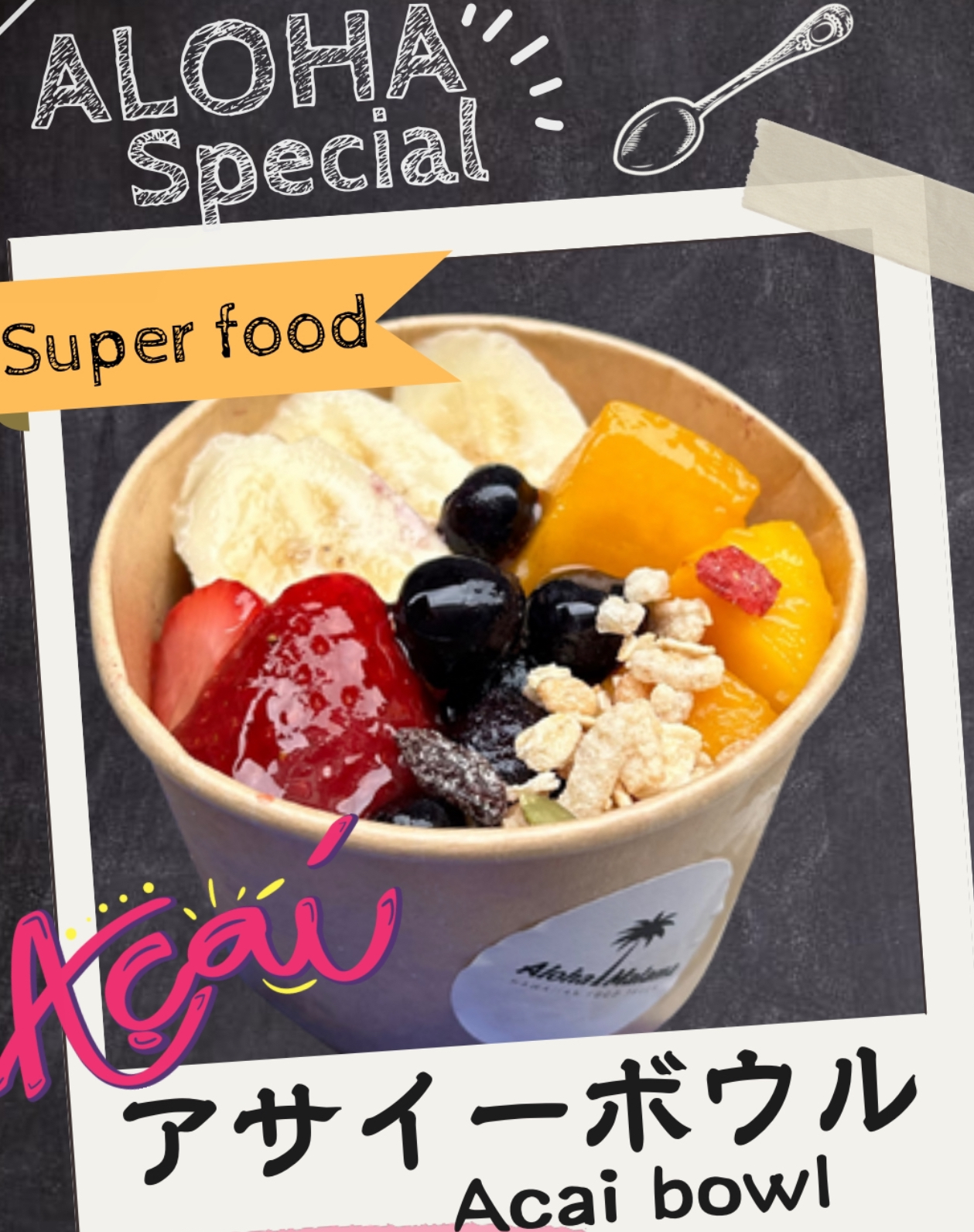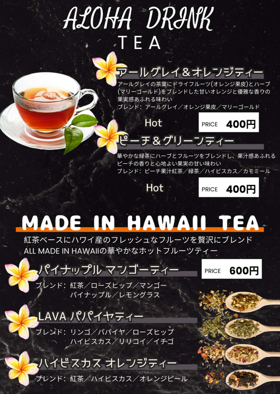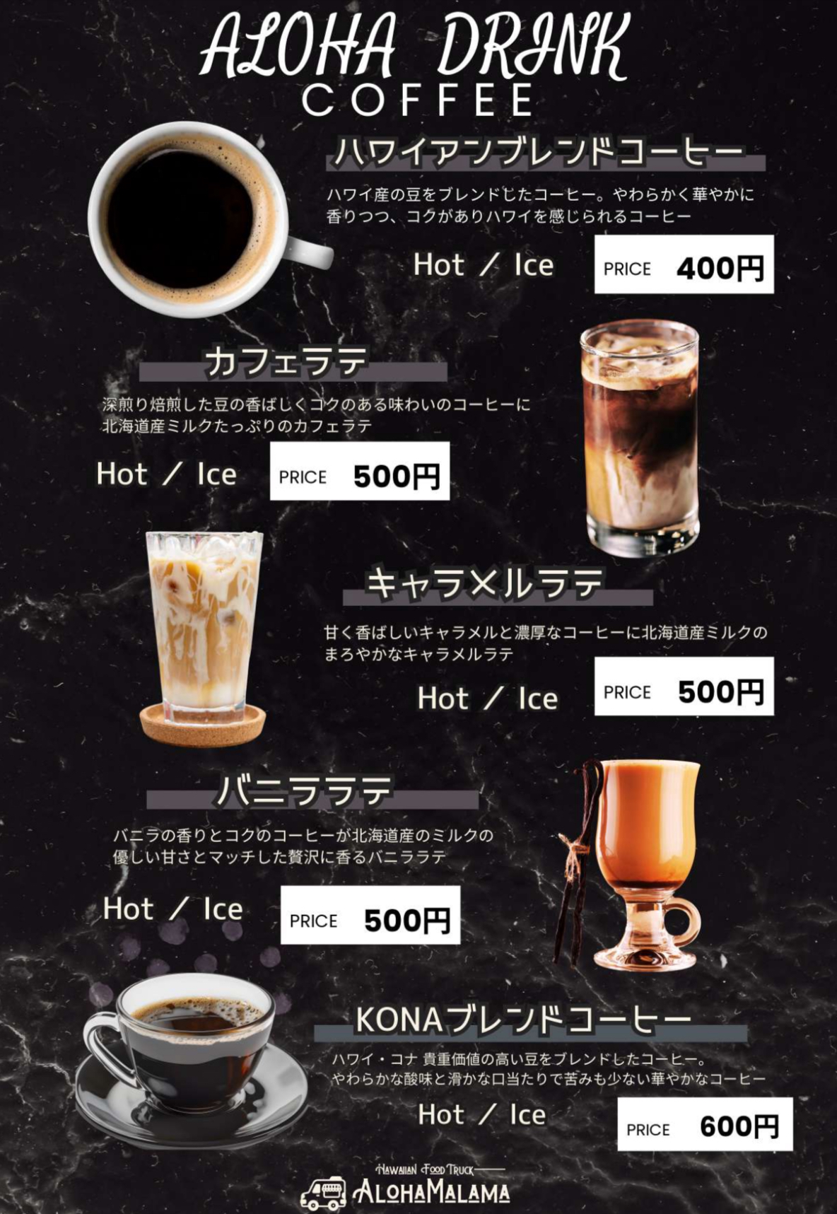 ハワイアンコーヒー、レモネード、マラサダ、モチコチキン、ガーリックシュリンプ、タコライス他