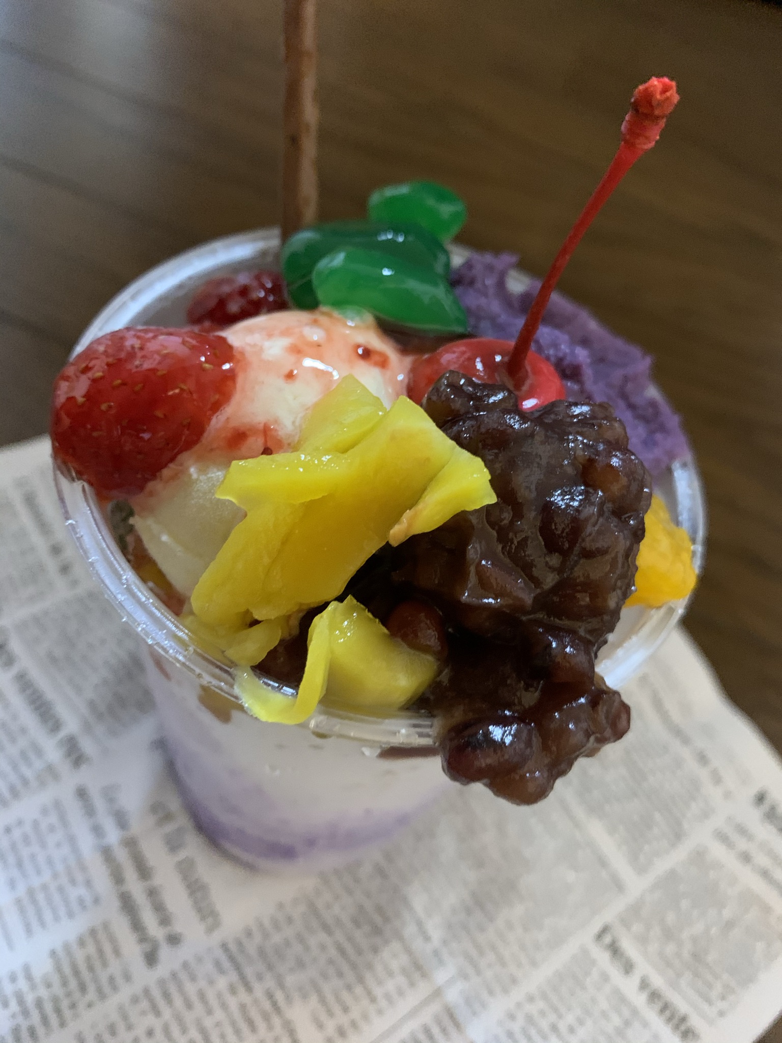 「ハロハロ」とは、フィリピンのかき氷🍧ウベ(紫芋)をココナッツ風味のソースに仕上げ、タップリトッピングしました。ジャックフルーツやココナッツ等フィリピンの味が楽しめます。