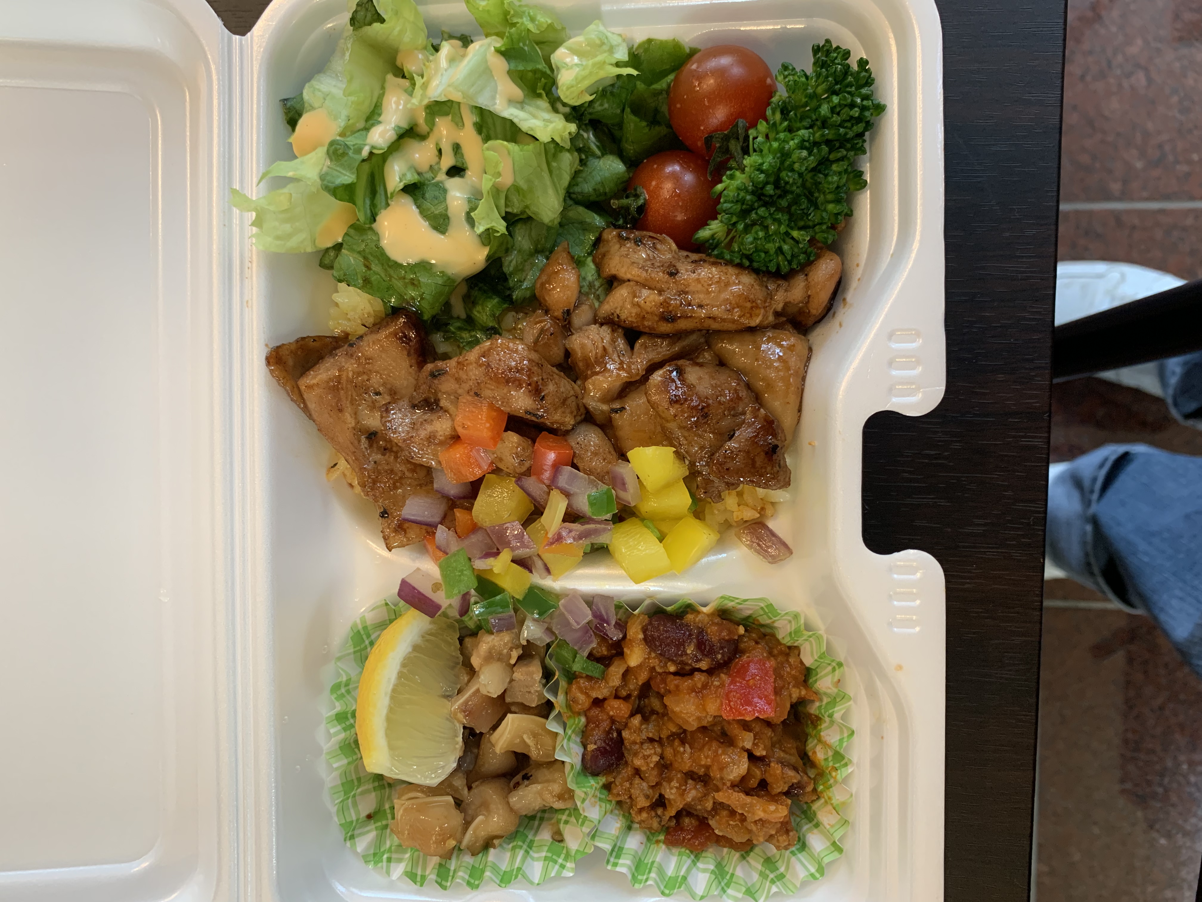 スパイシーチキンのBBQ・シシグ(豚の耳とバラ肉を炒めたフィリピン料理)を中心にハーブライスと共にワンプレートに盛り込みました。プロの料理人が手造りした納得の一皿です。