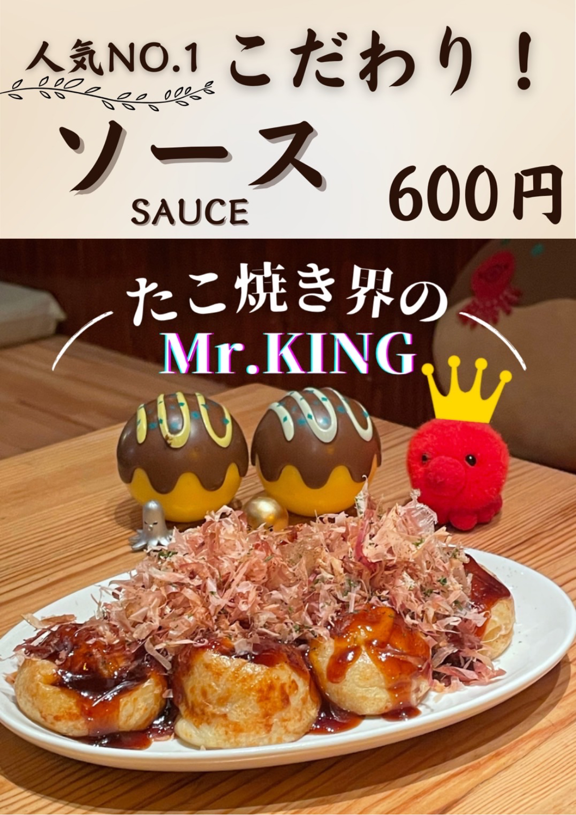 10年以上継ぎ足ししている濃厚かつほんのり甘みのあるオリジナルソース、築地の老舗蕎麦店「長生庵」の揚げ玉、熊本県産のジャージー牛乳を使った生地など、たこ焼きに使用する素材はこだわり尽くし。定番の「ソースたこ焼き」をはじめ、「明太マヨネーズ」、「九条ねぎポン酢」、「チェダーチーズ」など、たこ焼きを愛して40年の店主が魂を込めて「ふわとろのたこ焼き」を焼き上げます。