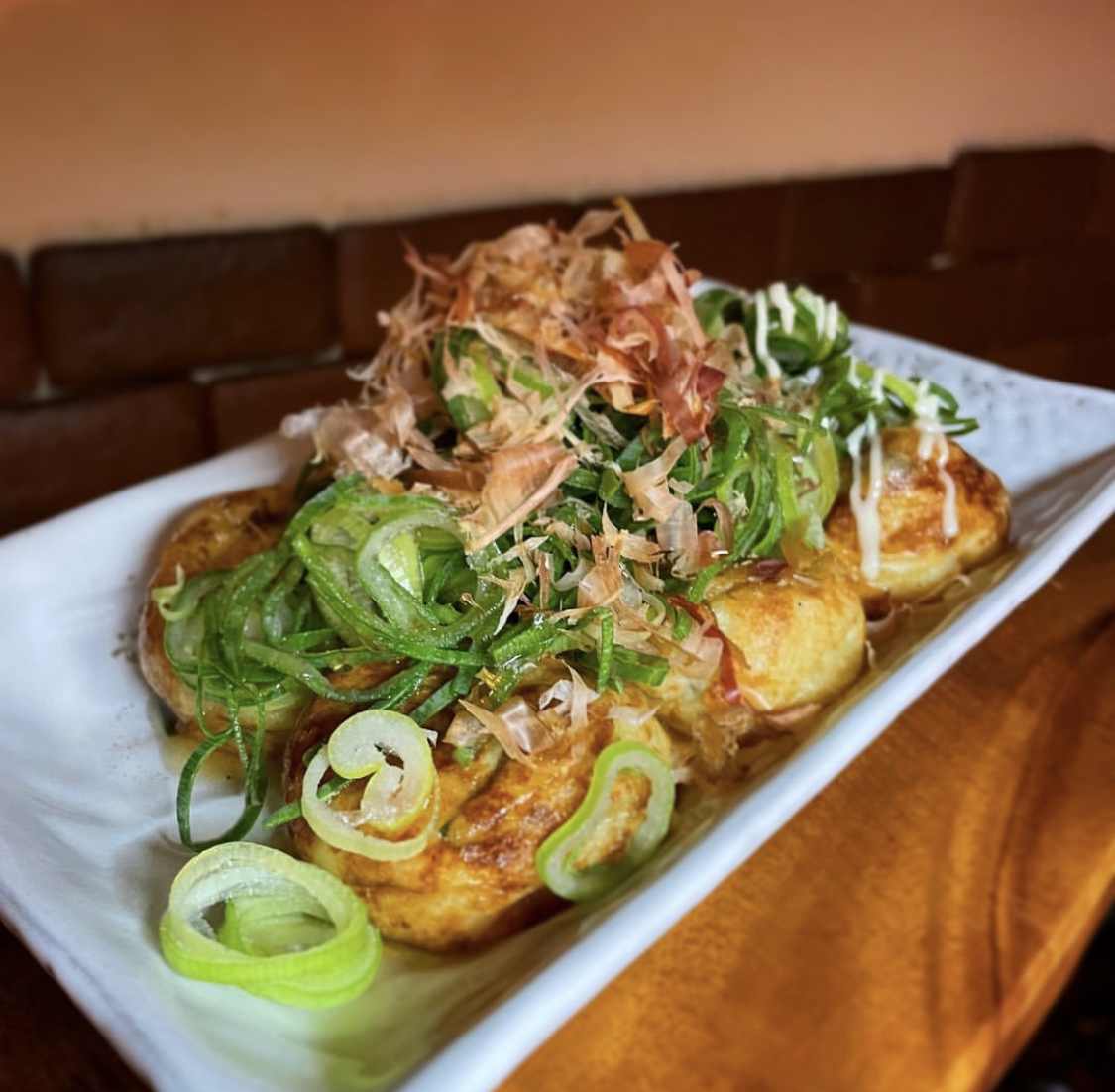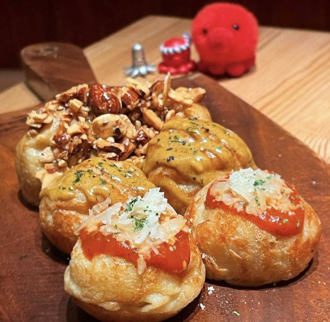 たこ焼きは4種類のソースをブレンドし10年以上継ぎ足ししたソースは濃厚でほんのり甘みもあり、築地長生庵様の揚げ玉を使用する事で香り深く生地には熊本県産ジャージ牛乳を使い熱々のふわとろのたこ焼きを提供しております