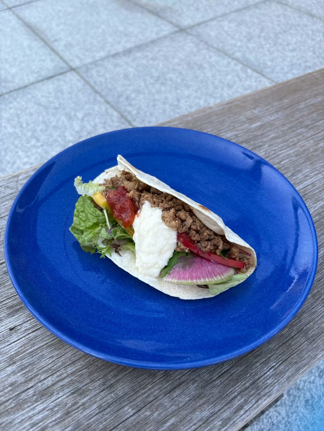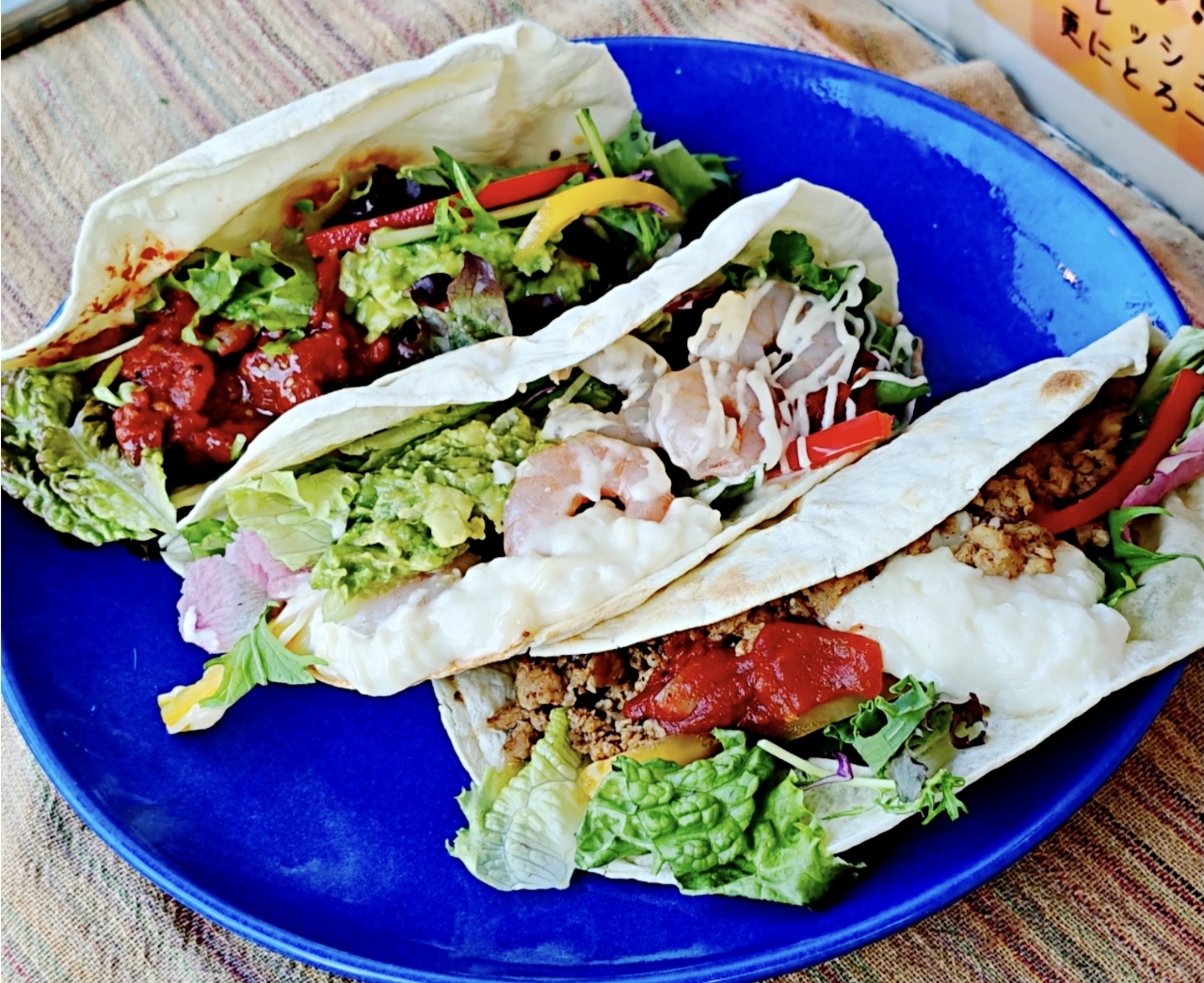 常時5品目以上の季節野菜を自家製ドレッシングで仕上げたサラダと高温で一気に炒めたジューシー粗挽きタコミート、更にはフレッシュのアボカドのトッピングしたタコライス。ホットソースも手作りです。