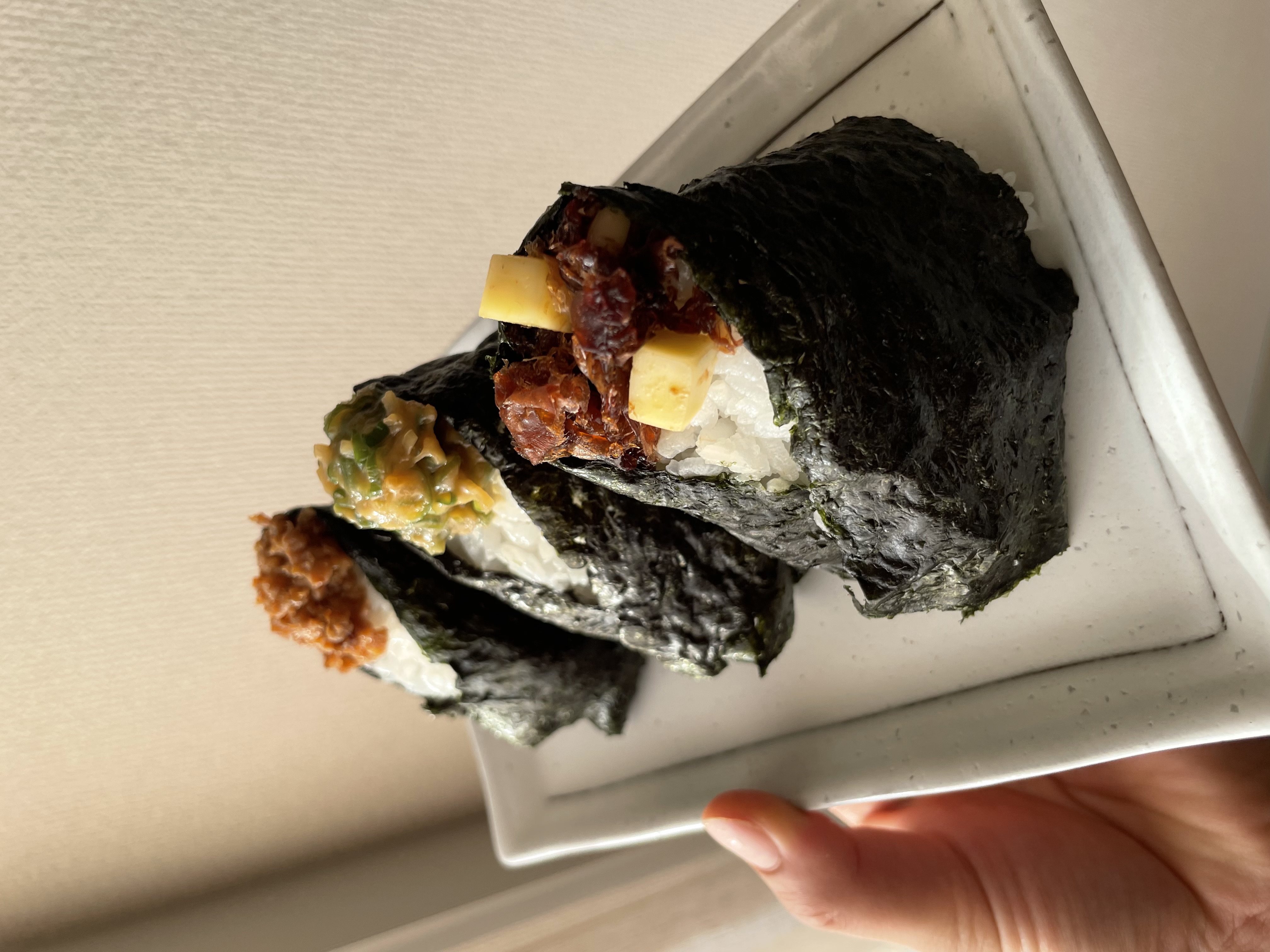 【おにぎり】ガパオ、鮭、梅、辛子明太子おにぎり、辛子明太マヨ、ツナマヨ、高菜、こんぶ、おかか、チーズおかか、ねぎ味噌、鶏そぼろ、塩むすび、味噌汁