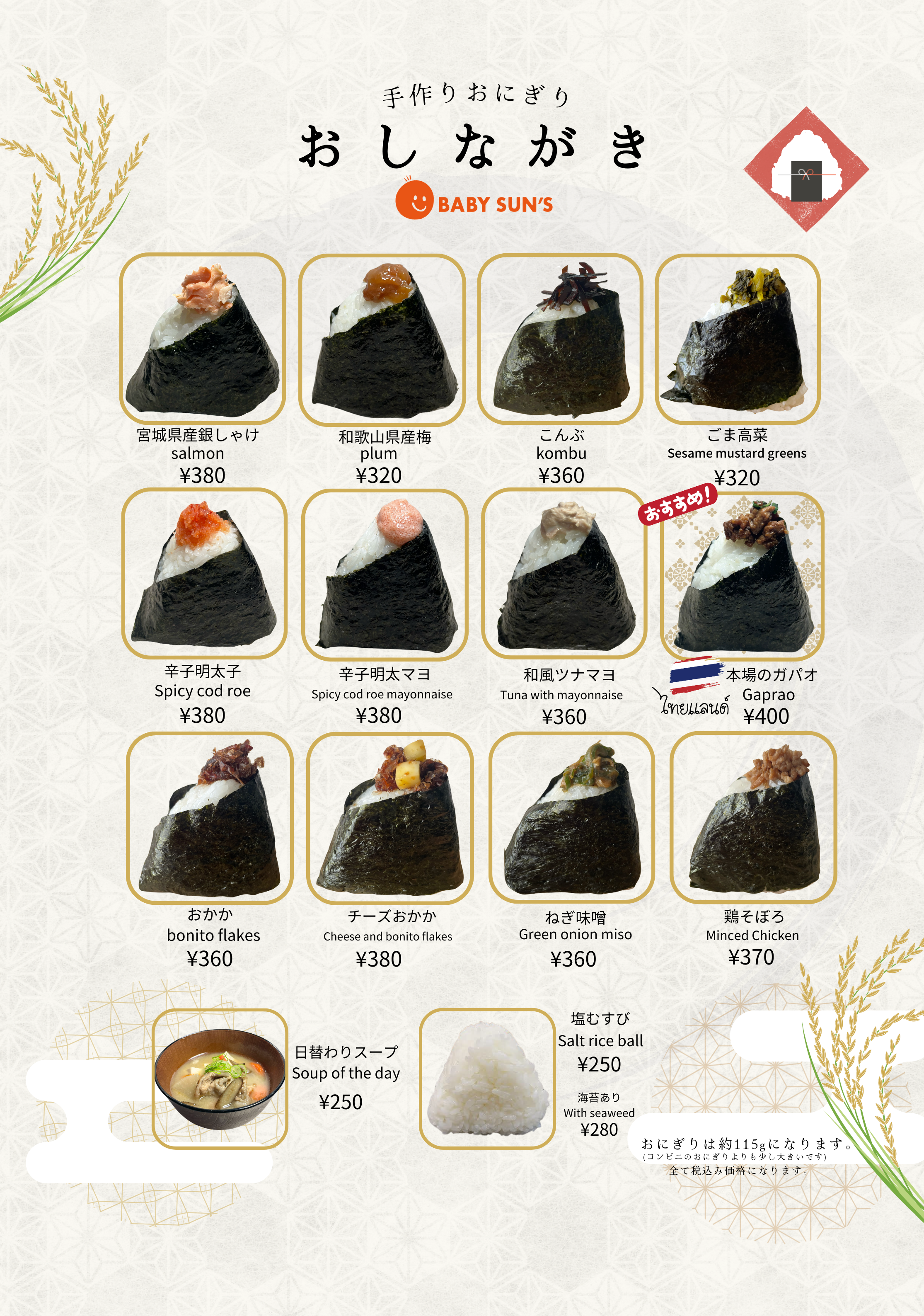 BABY SUN'Sのおにぎりは、できたてのほかほかのおにぎりを楽しんでいただけるように、ご注文が入ってから握っております。