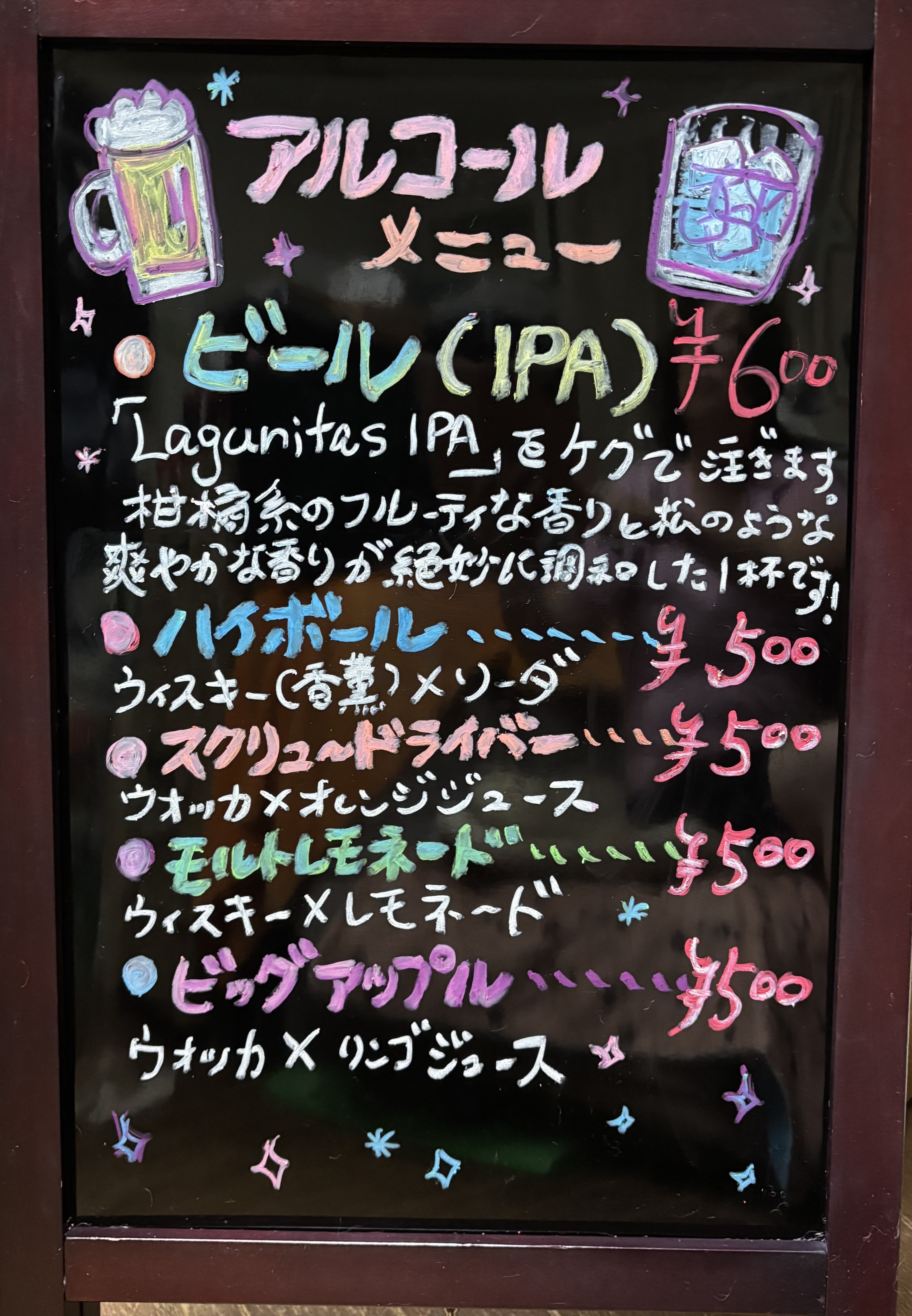 唐揚げ、キーマカレー、ドーナッツ、飲み物