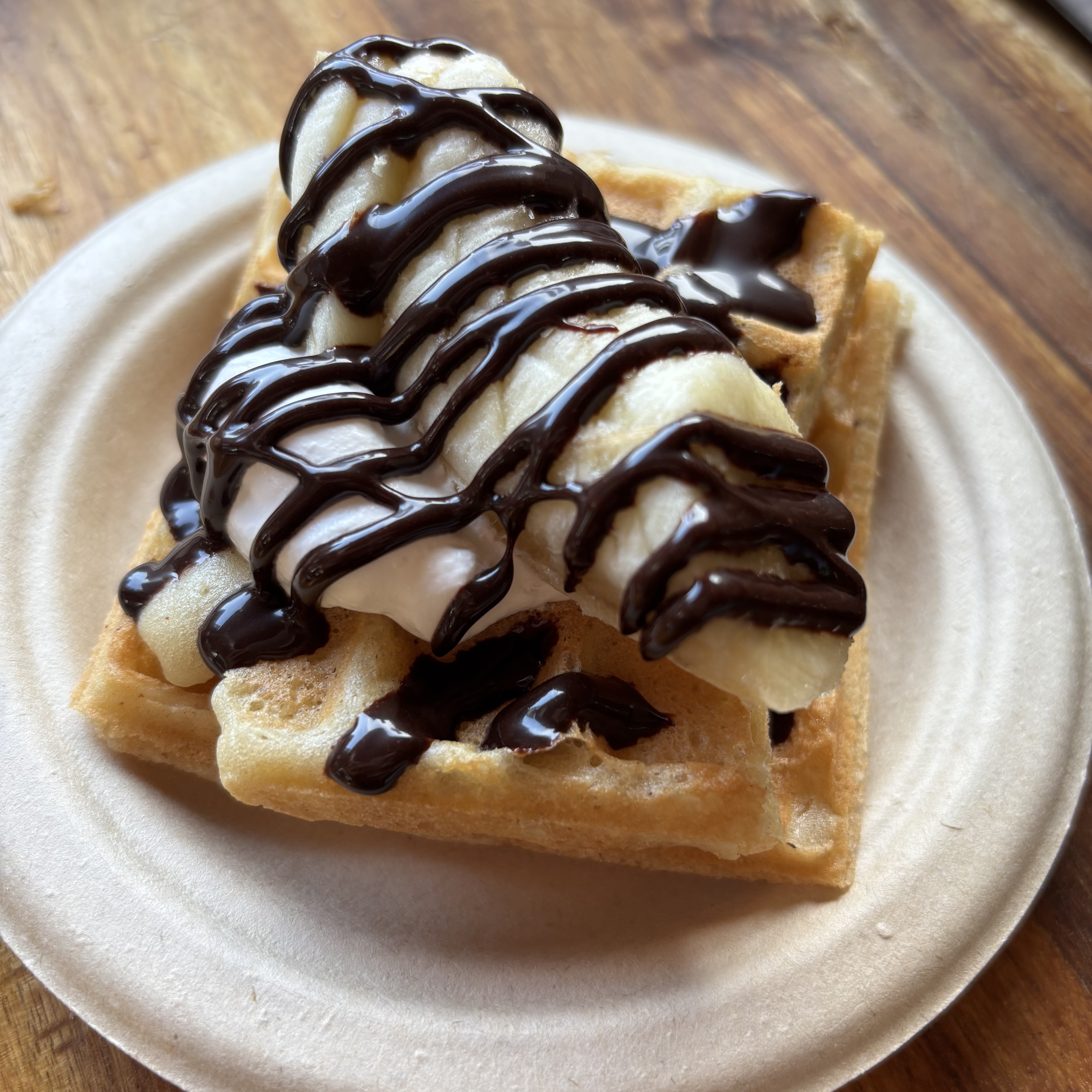 当店のメニューはすべて動物性不使用、グルテンフリーです。人気の米粉ワッフルは焼きたてでご用意しています。生地そのままでも美味しい、米粉の優しい甘さをご賞味くださいませ。