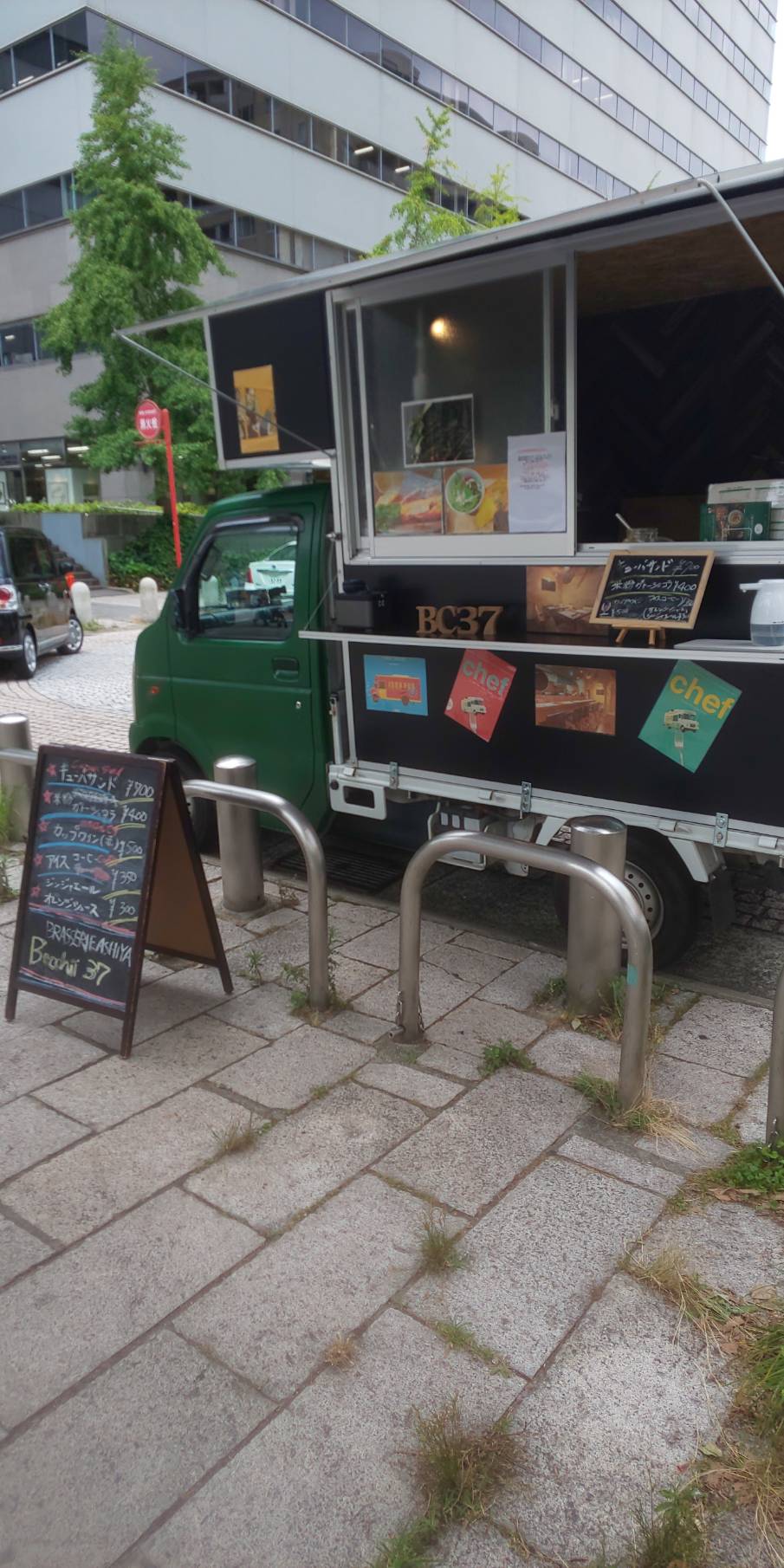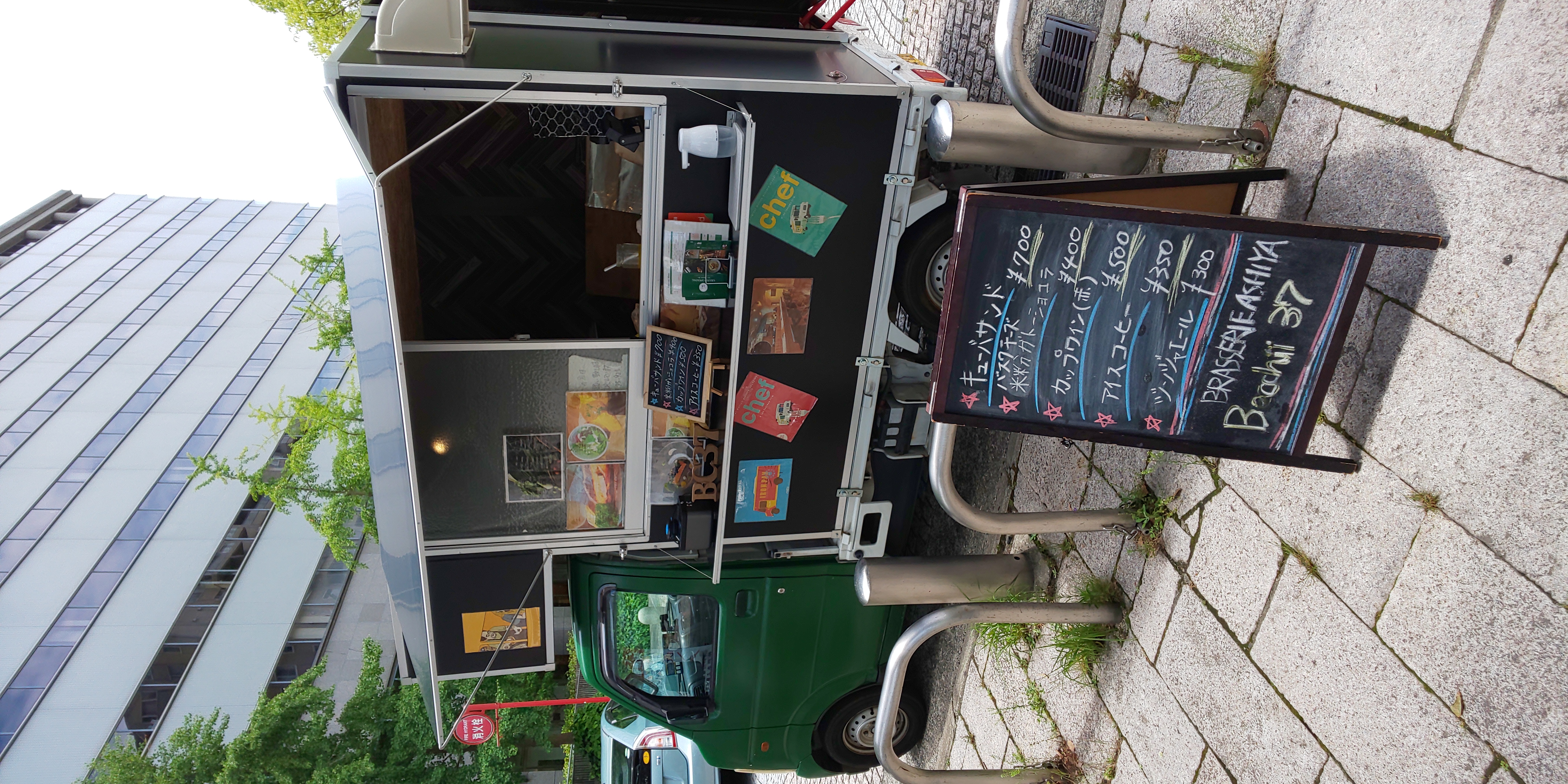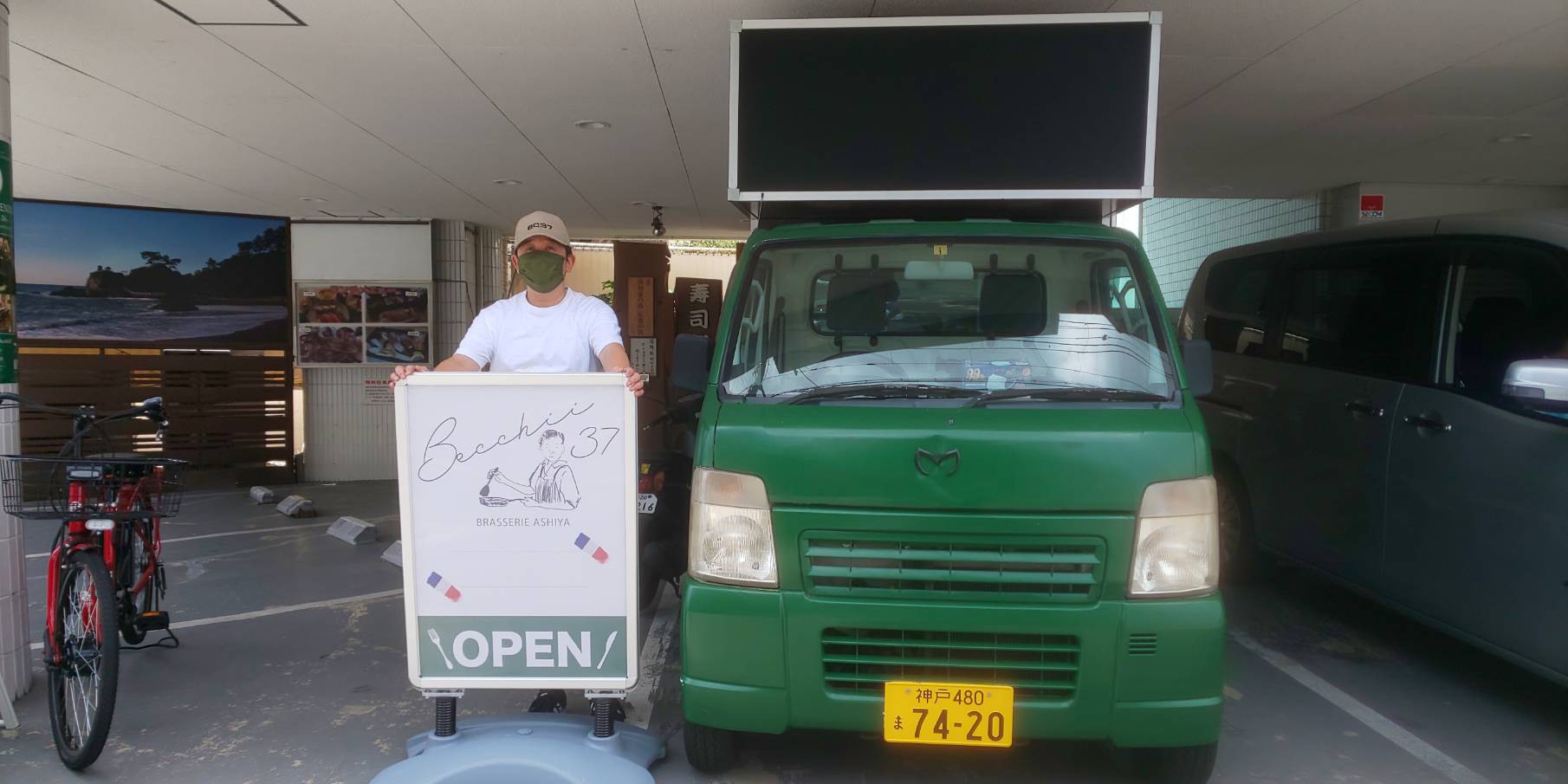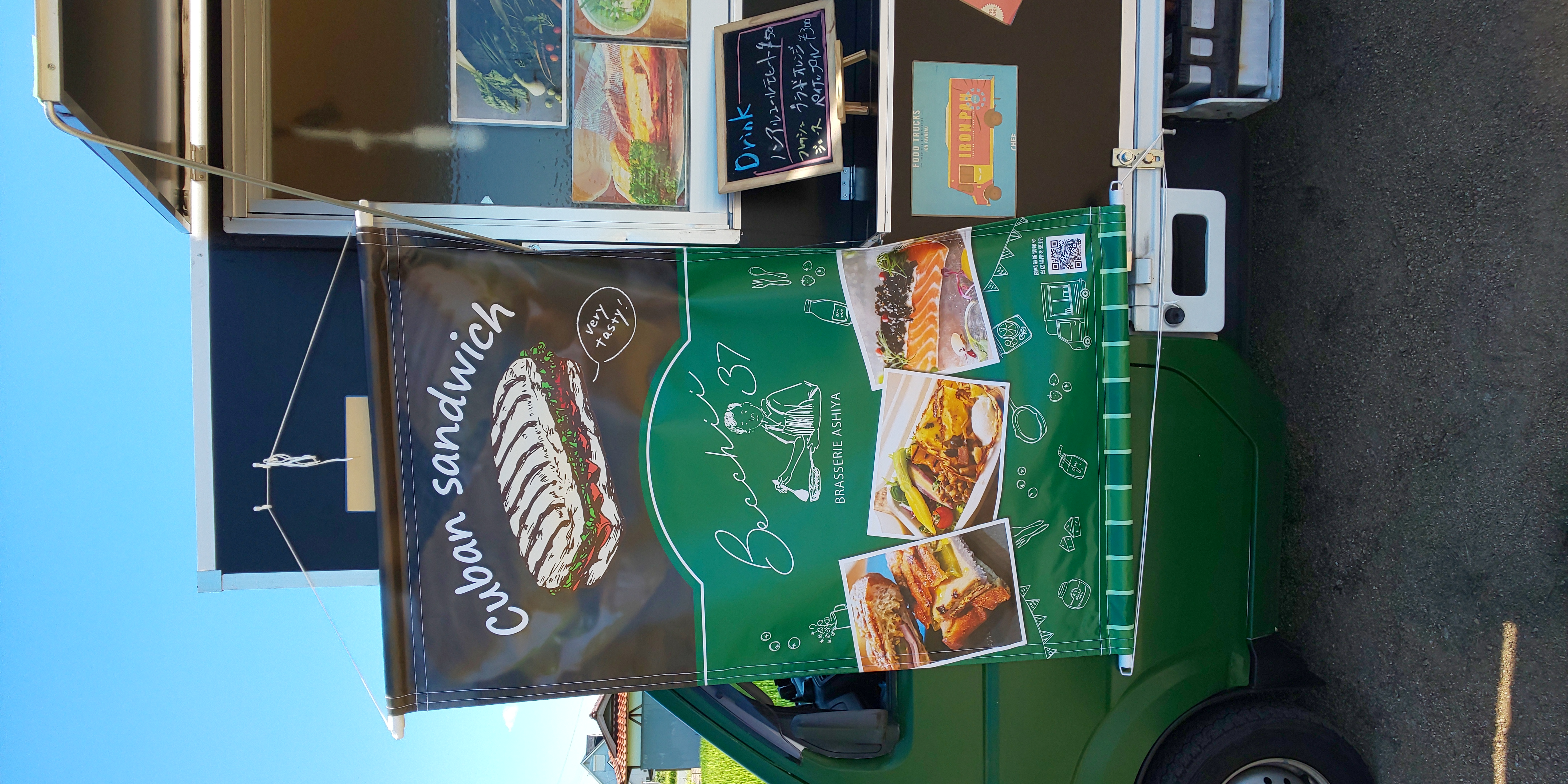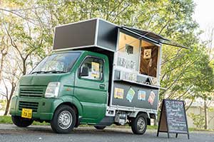 芦屋打出小槌町のお店と同じカラーの緑と黒のツートンカラーの軽自動車のキッチンカーです。軽自動車ですのでコンパクトで場所は取りません。