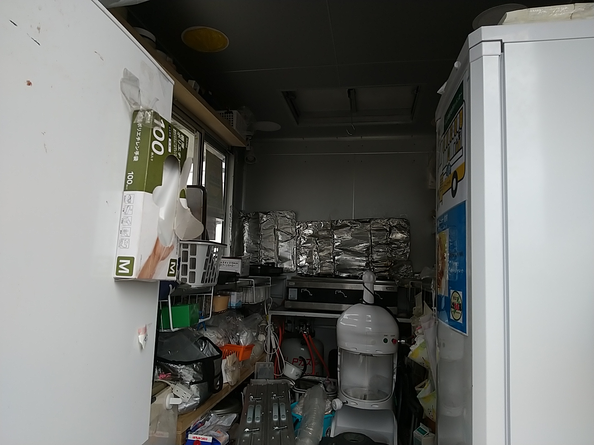 キッチンが広いので冷蔵庫、冷凍庫、保温庫、かき氷機、ガスコンロ3台の設備があり、ゆとりをもった営業が出来ます。