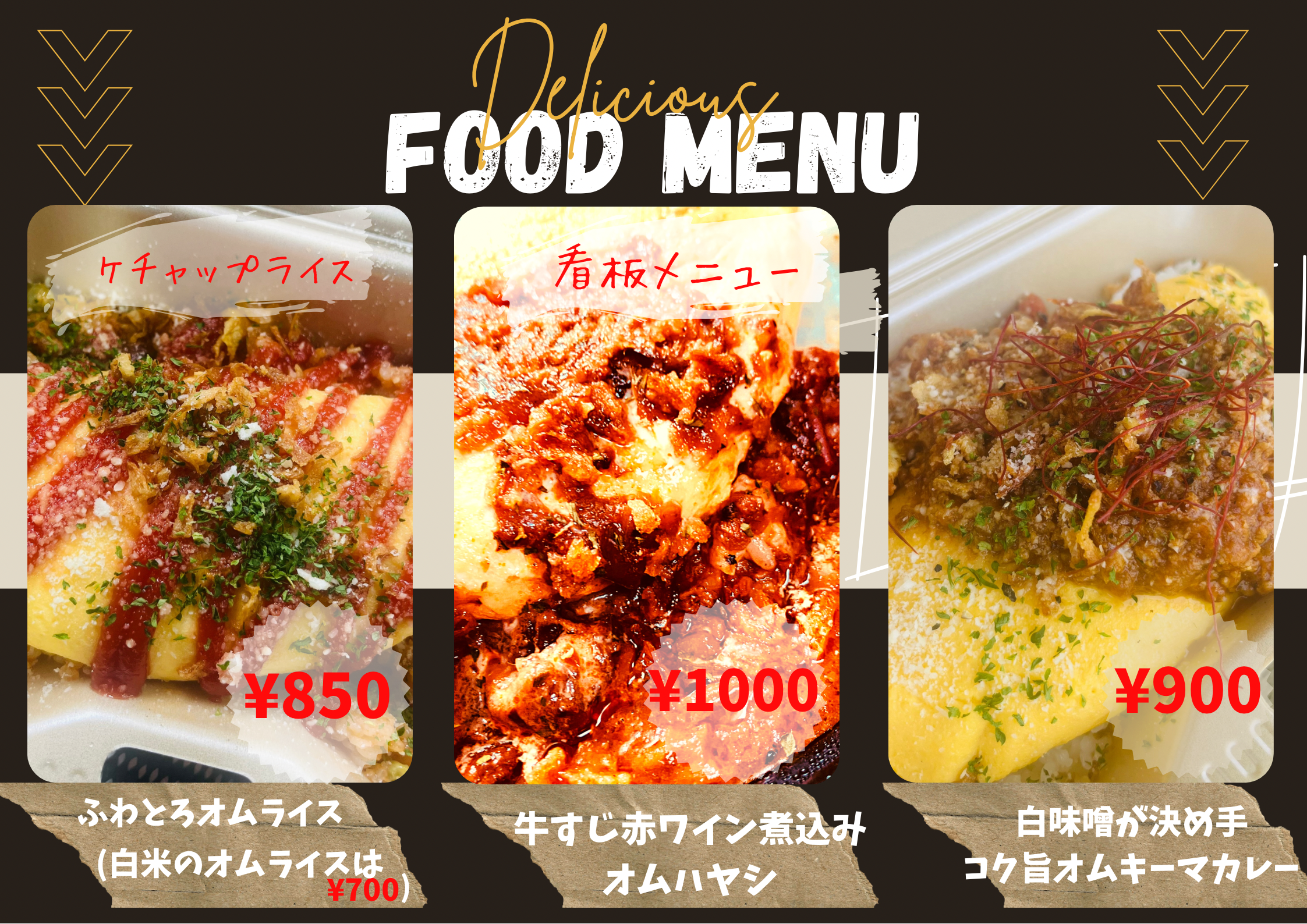 トロトロに赤ワインで煮込んだ牛すじと、濃厚なデミグラスのハヤシソースをふわとろのオムレツに掛けました。ほんのり和風テイストにて、お米との相性も抜群!