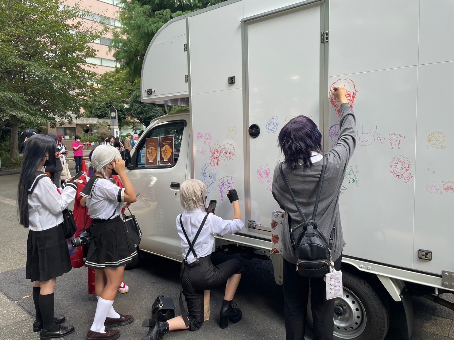 なぜなら、いらっしゃったお客様方に商品をお待ちの間に車体に好きな落書きをしてもらいお客様と共にキッチンカーを完成させるというコンセプトにあります。