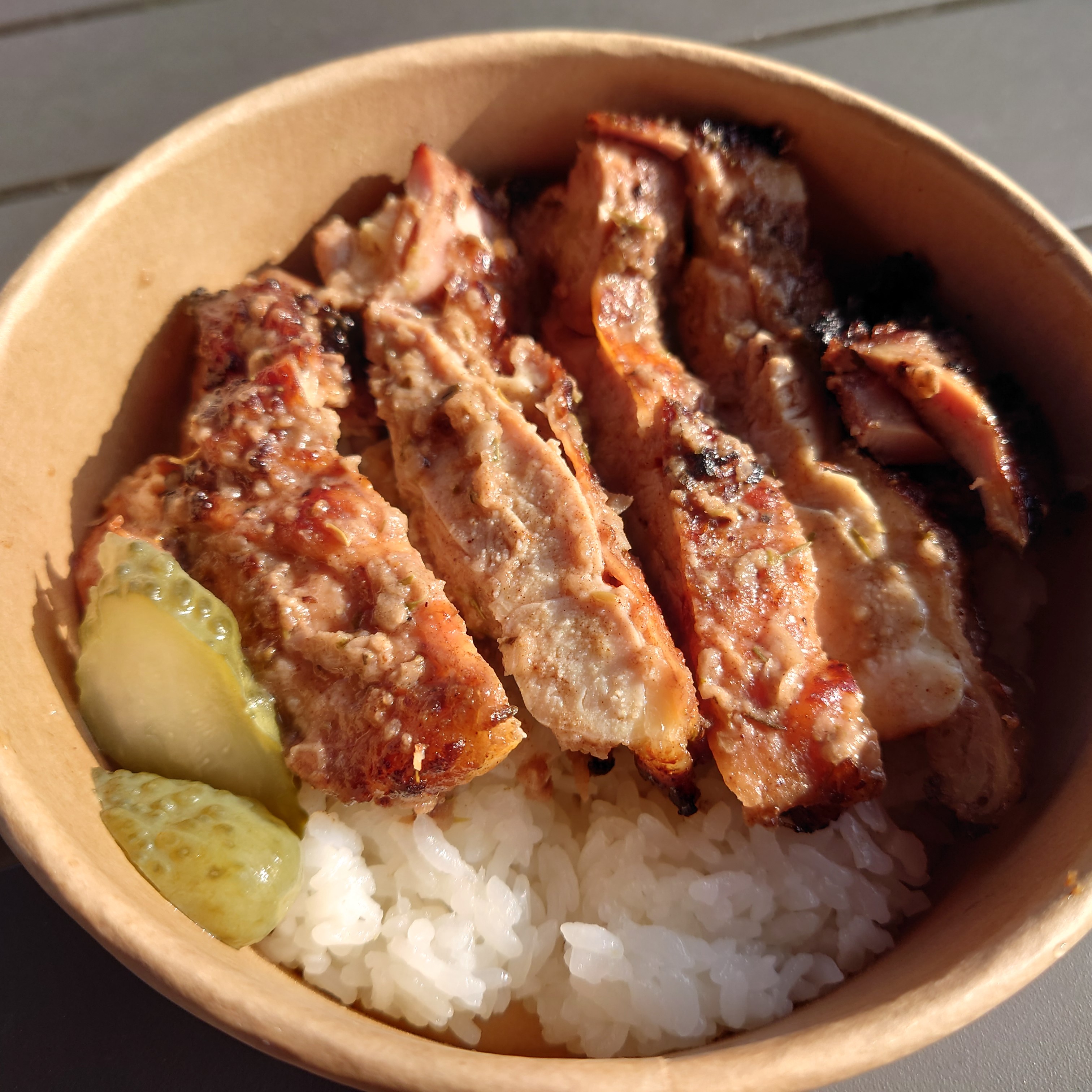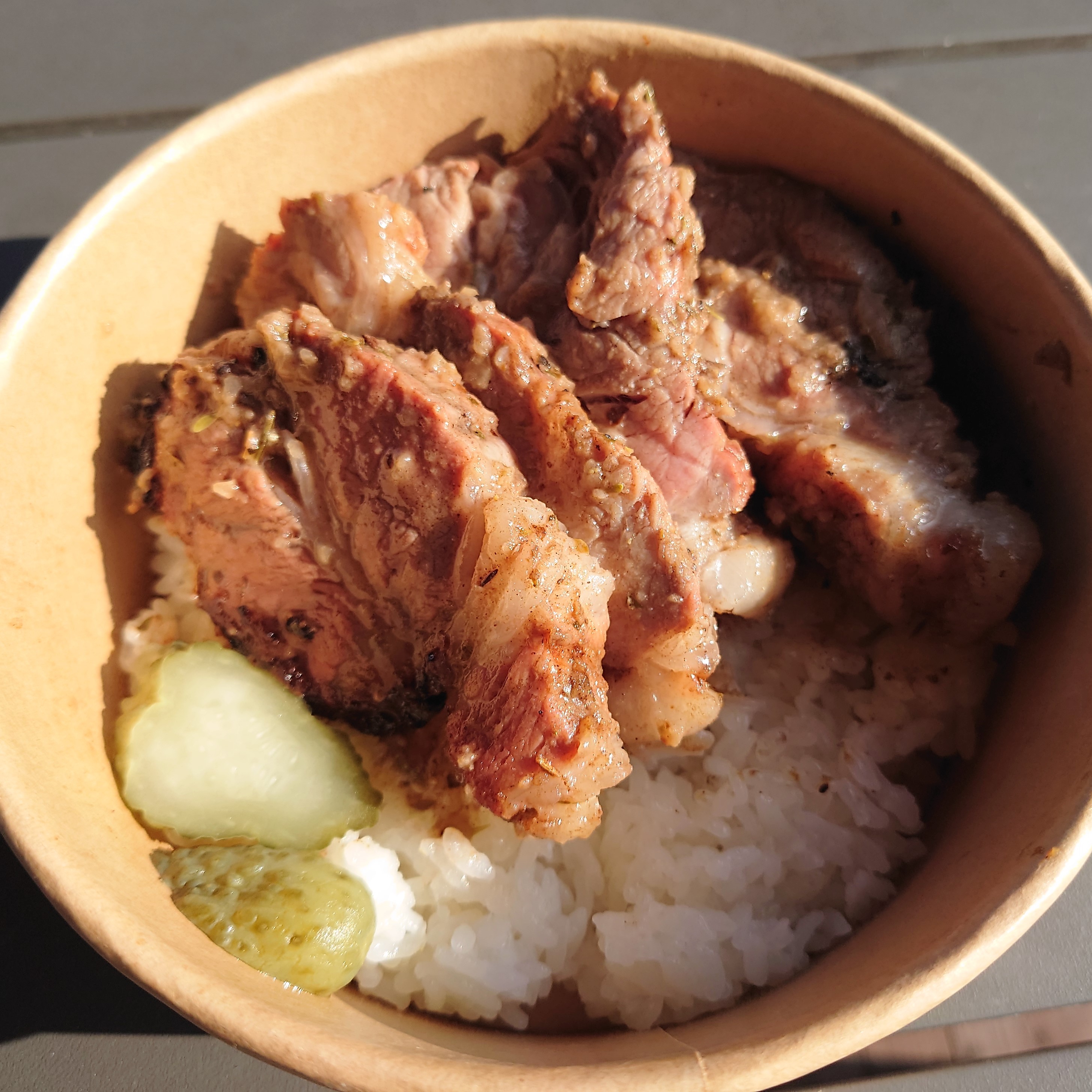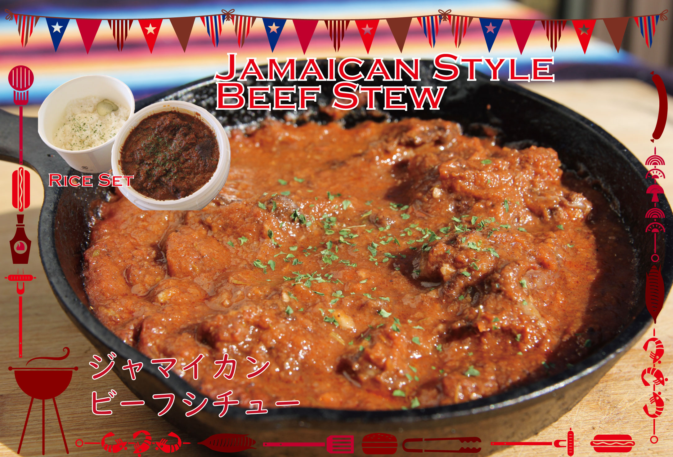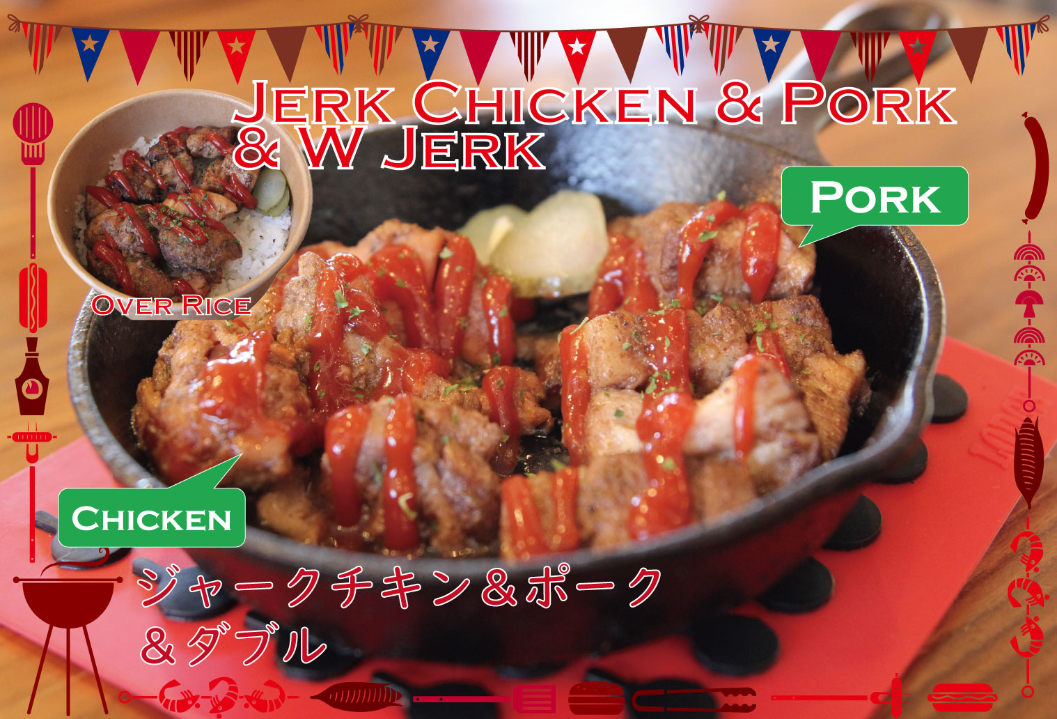 ステーキライス、スペアリブのグリル、モホローストポーク、ジャークチキン
