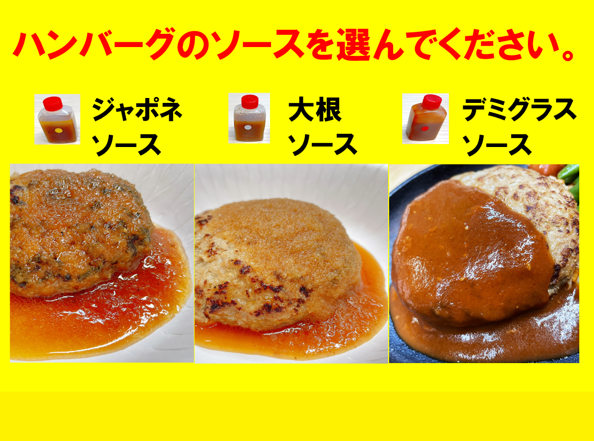 玉ねぎなどの食材でじっくり作った和風ジャポネソース、おろしポン酢の大根ソース、人気の定番デミグラスソースになります。