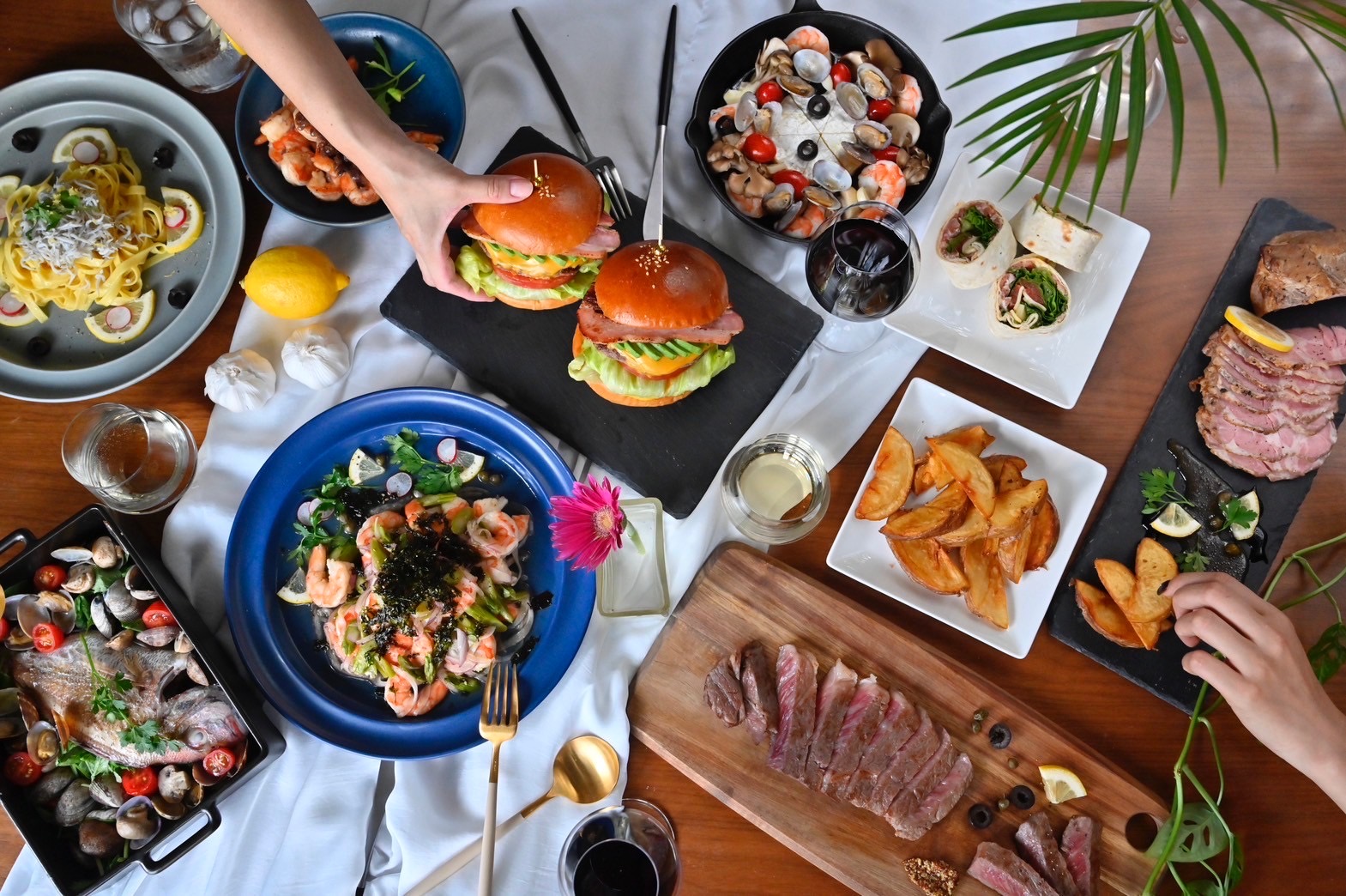 ハンバーガー類、ポテト、レモネード、ジンジャーエール、コーヒー、アルコール