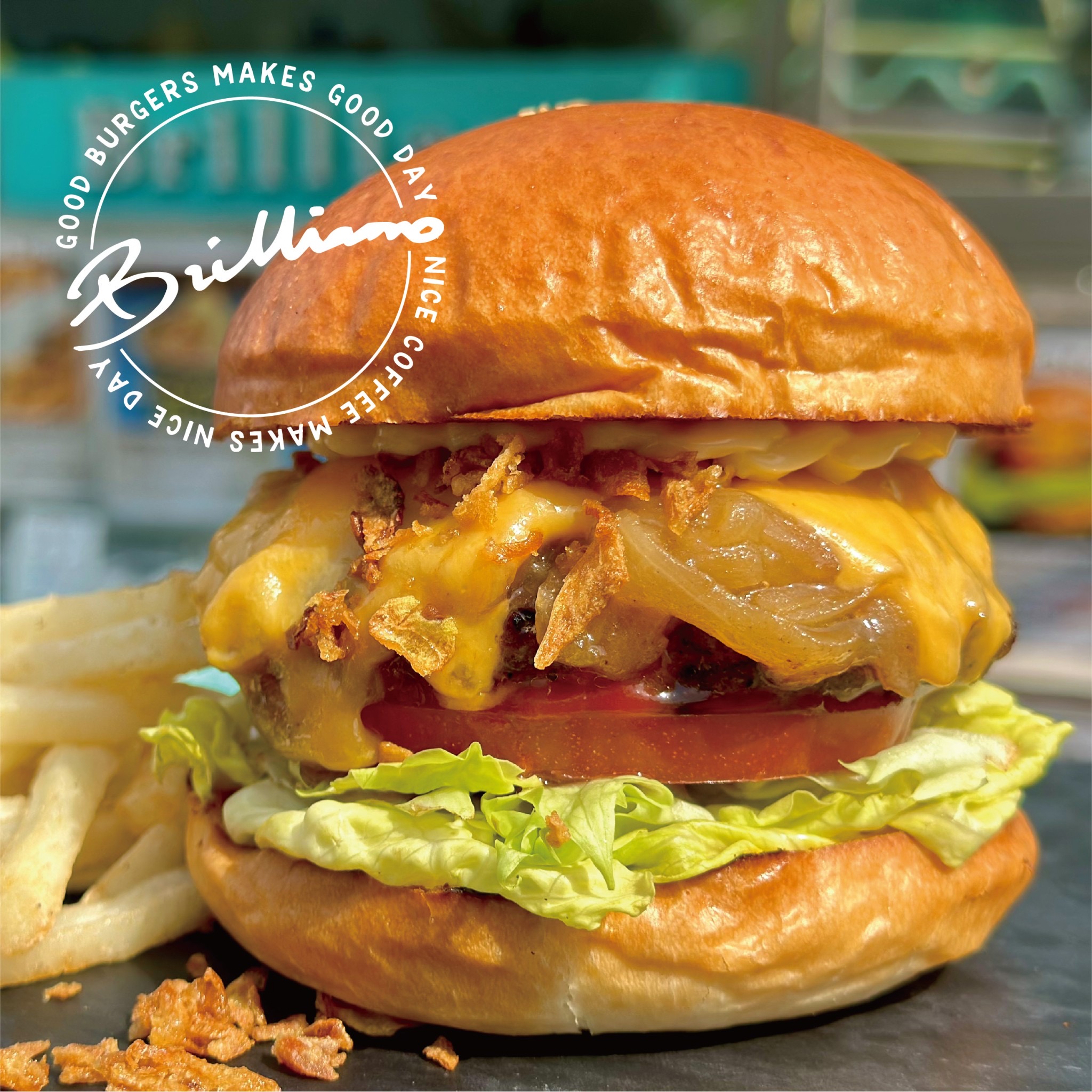 小麦とバターの香りがリッチな当店特注のハンバーガー専用バンズ、そして精肉店より部位指定で卸している和牛とオージービーフの黄金比ビーフ100%パティ使用!!