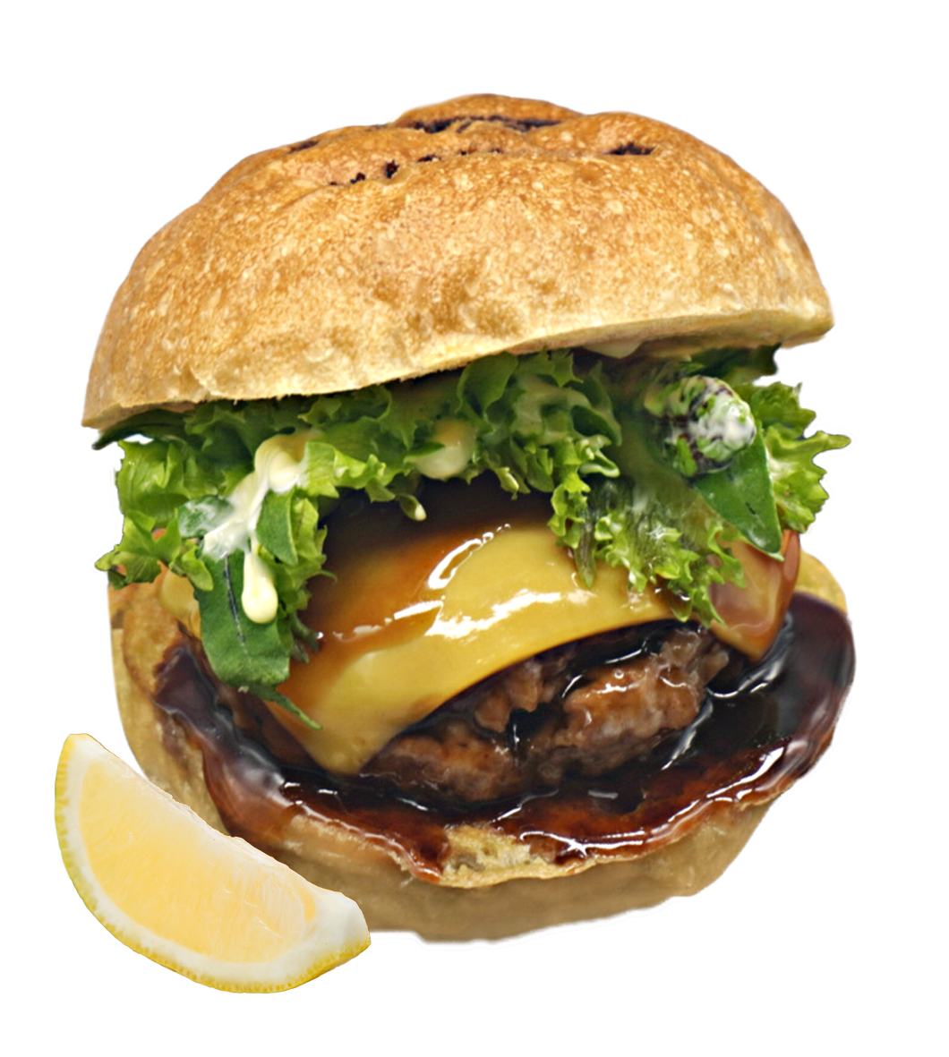 黒毛和牛入りジューシーパティに自家製テリヤキソースと無農薬レタスを合わせました。別添のレモンで味変も楽しめます!