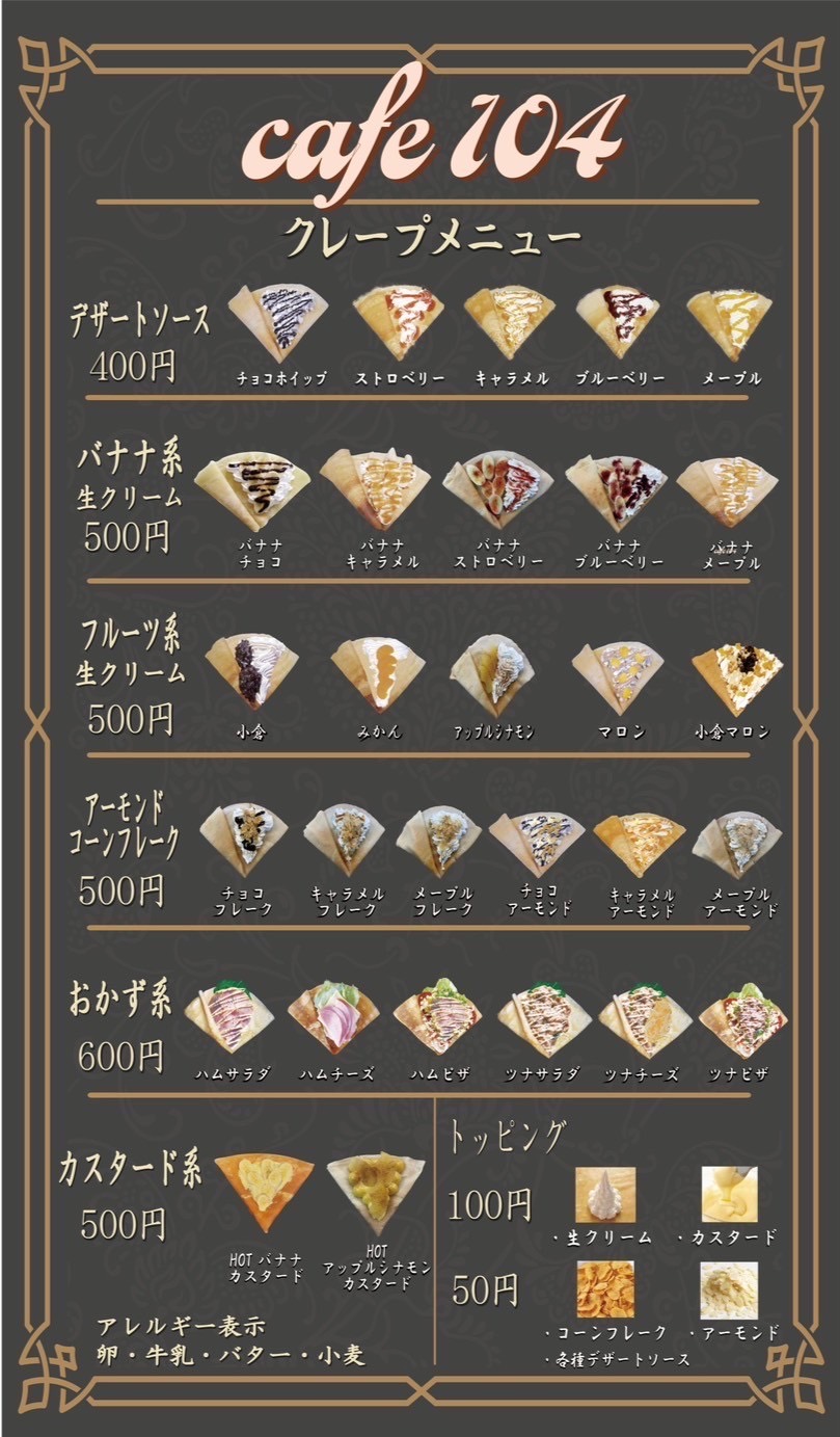 クレープ30数種、スイーツ系から、おかず系まで、さらにお好みでトッピングの追加もできます。