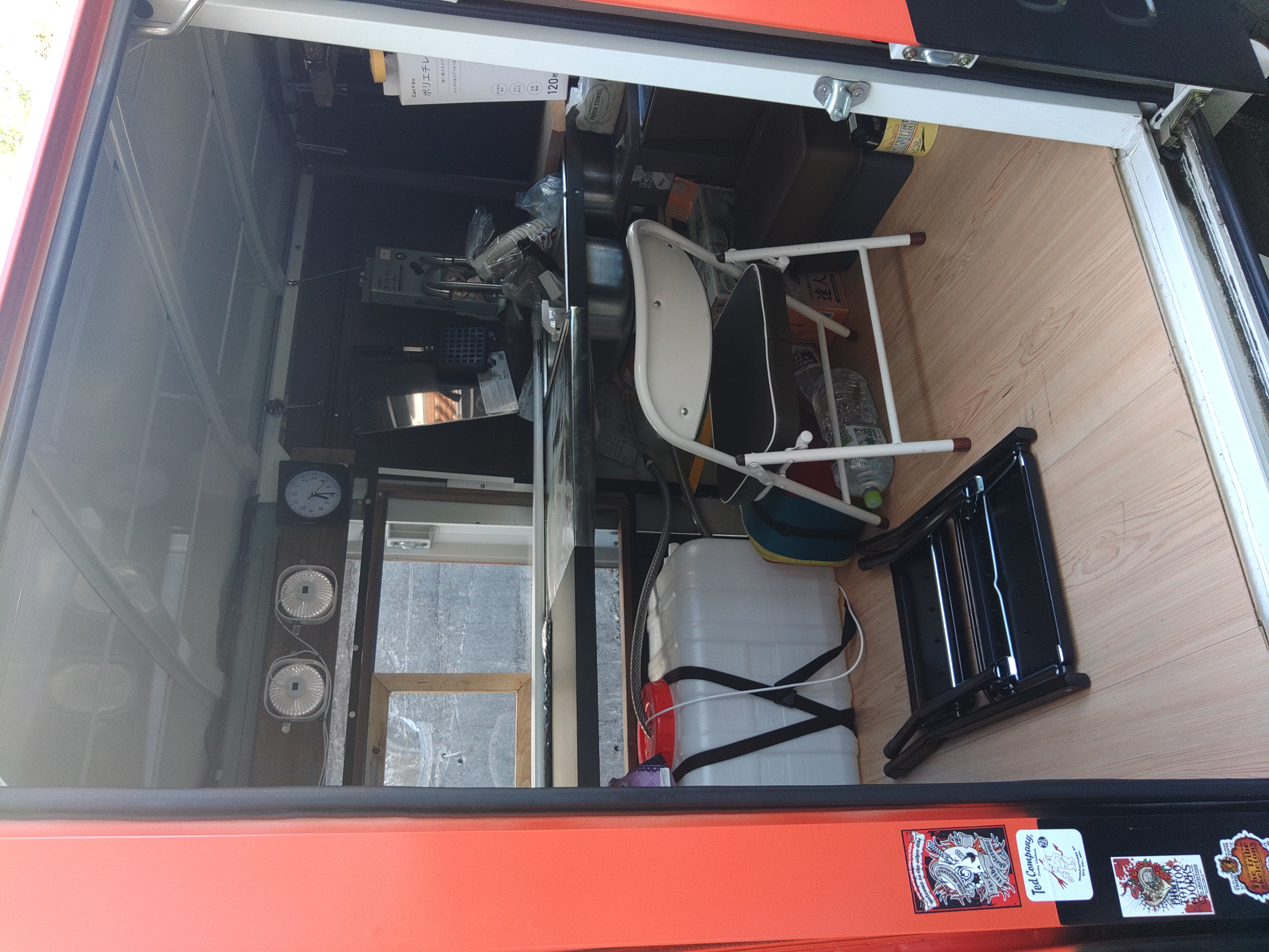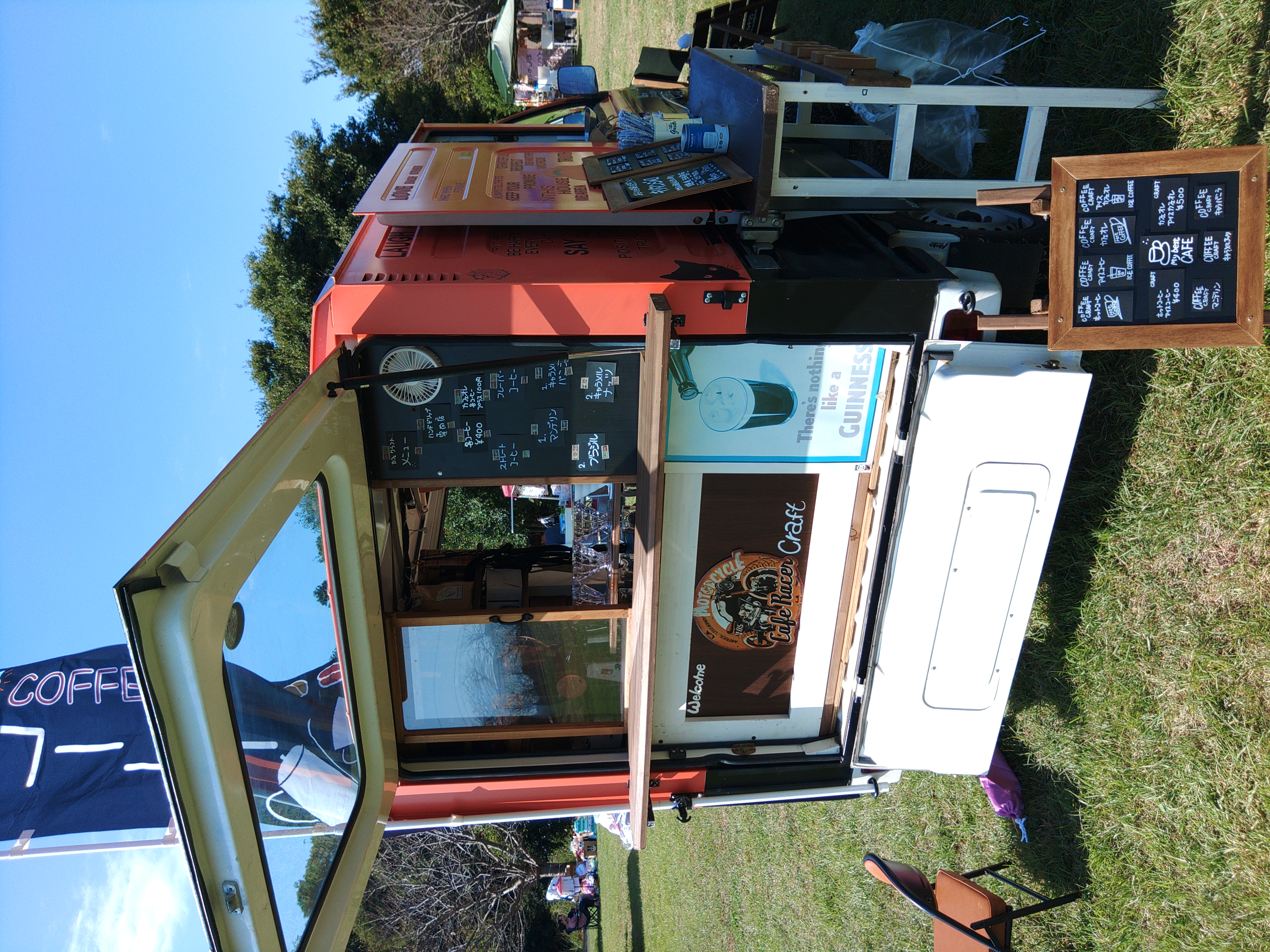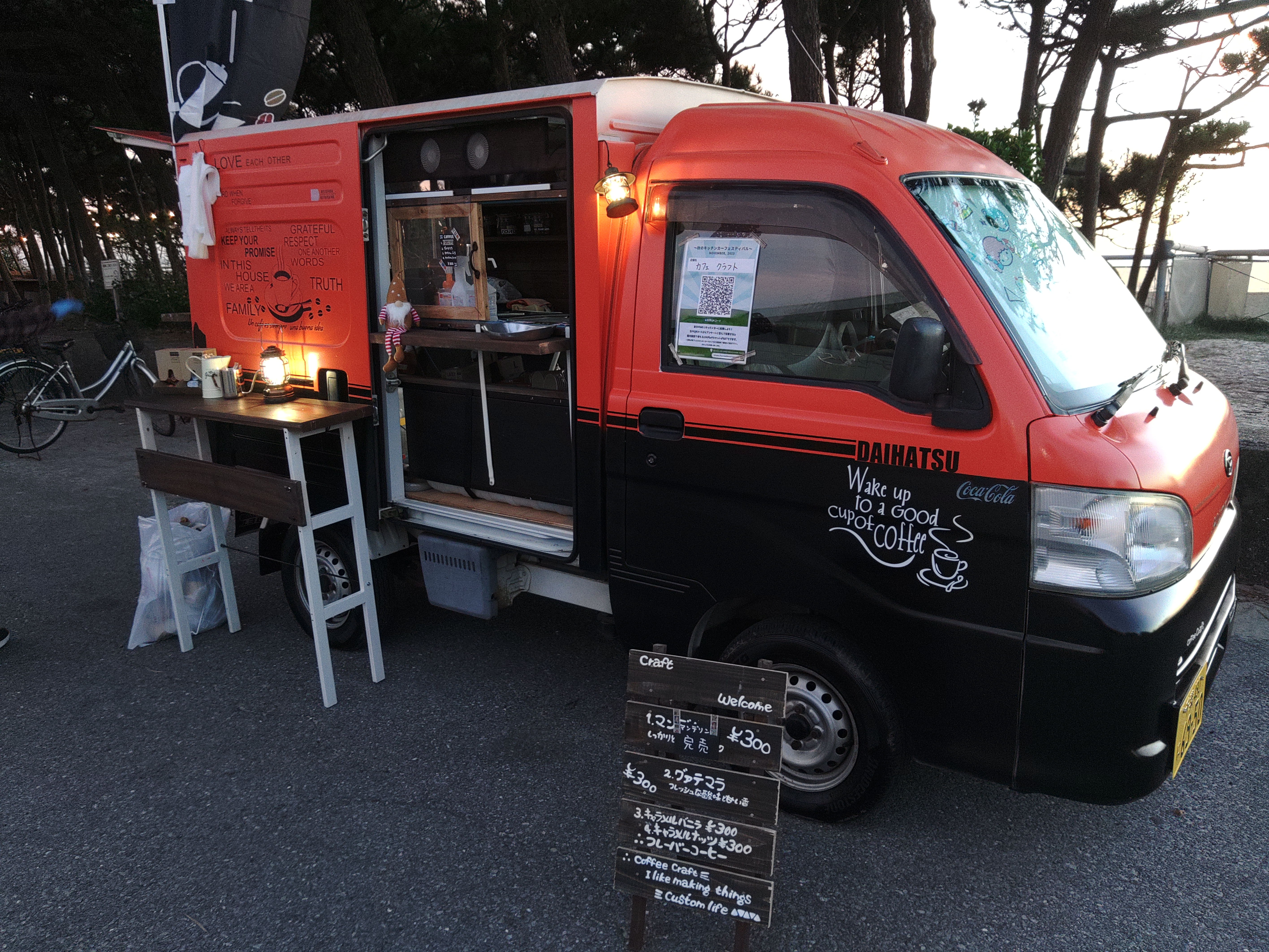パネルバンを使った自作のキッチンカー。オレンジを目印に淹れたてのコーヒーをお楽しみください。