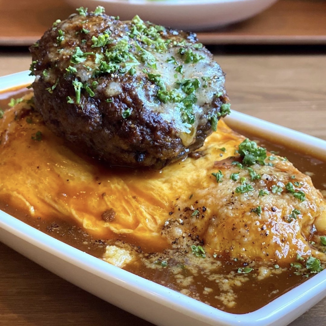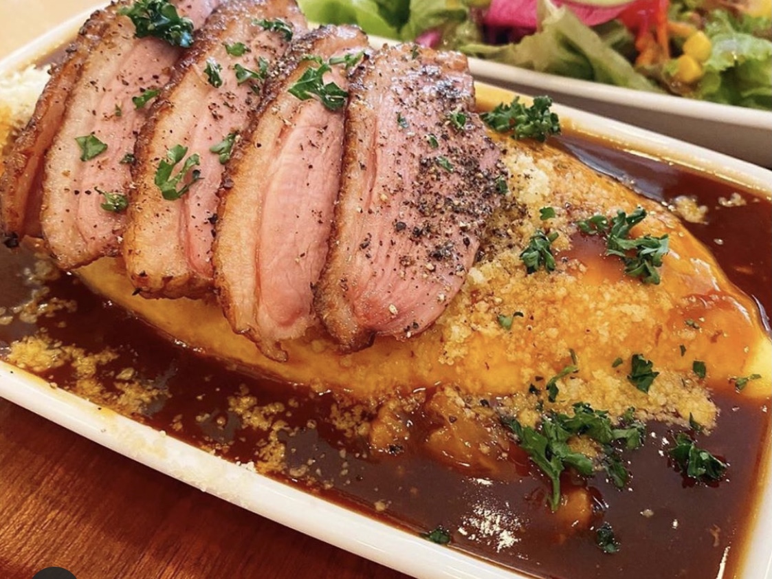 ギュッとお肉の詰まった牛タン100%ハンバーグを乗せてみたり、悪い脂をゆっくりと焼きながら落とし、良い脂だけを適度に残したジューシーな合鴨ローストを乗せたオムライスの見た目は圧巻です(^^)‼︎