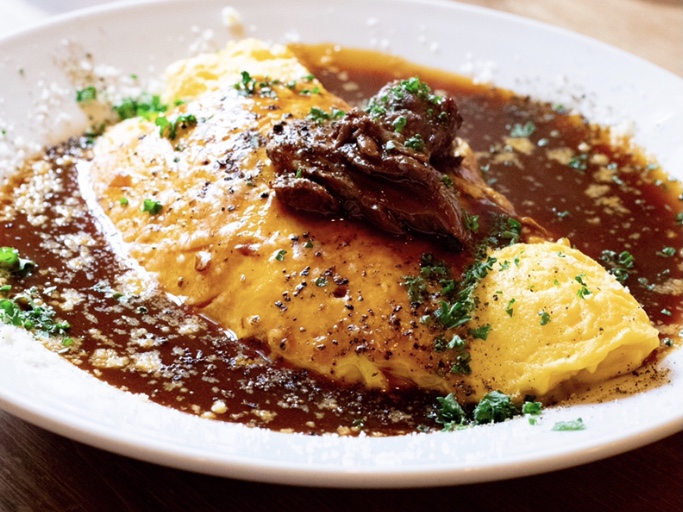 牛筋肉を5時間煮込んだビーフシチューをかけた絶品のオムライスです!