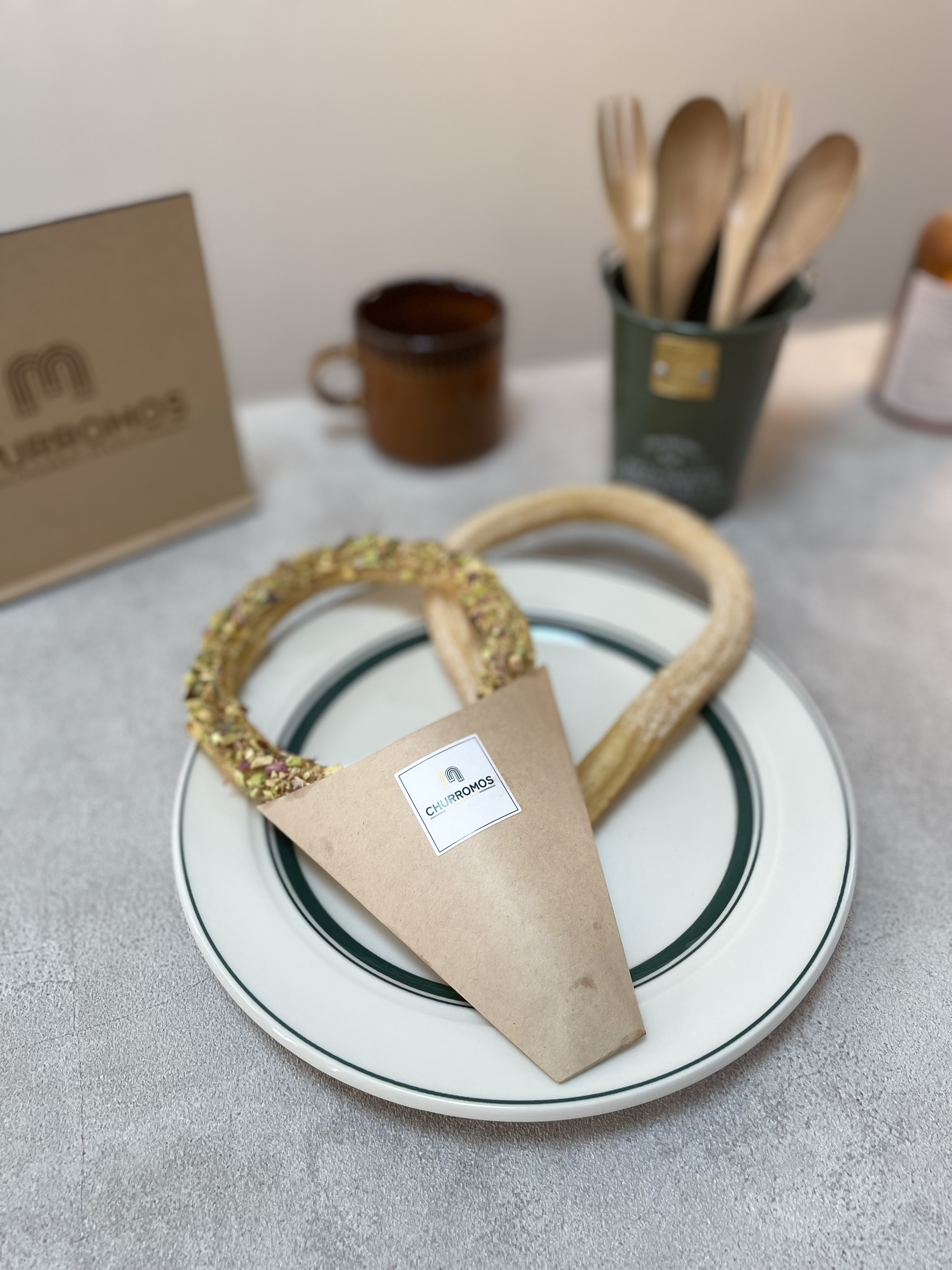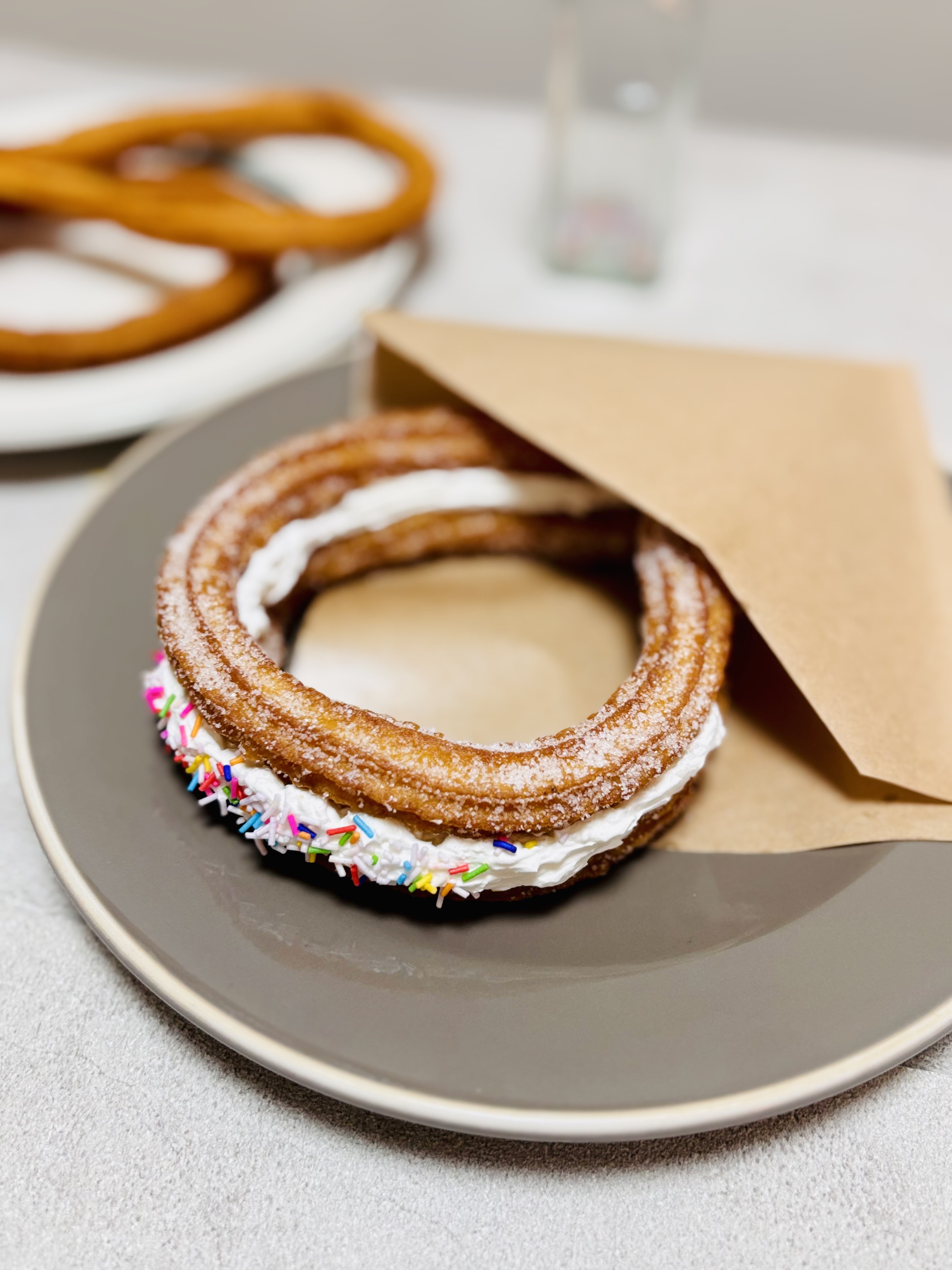 濃厚なフランス産のホワイトチョコレートソースを塗ったチュロスの上にカラフルで可愛いスプリンクルシュガーをトッピング。見た目にも可愛いく食感も楽しい人気のチュロスです。