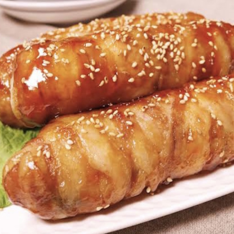 国産米をもち豚のバラ肉で巻いて自家製ダレで焼き上げました。