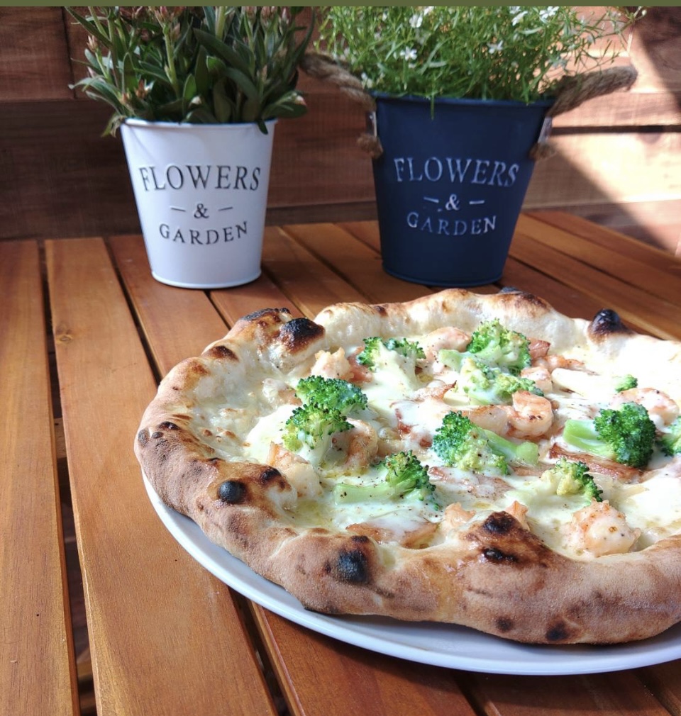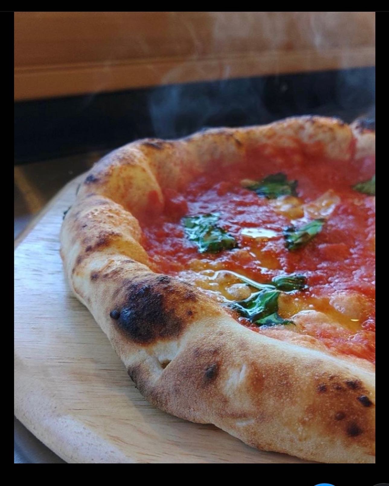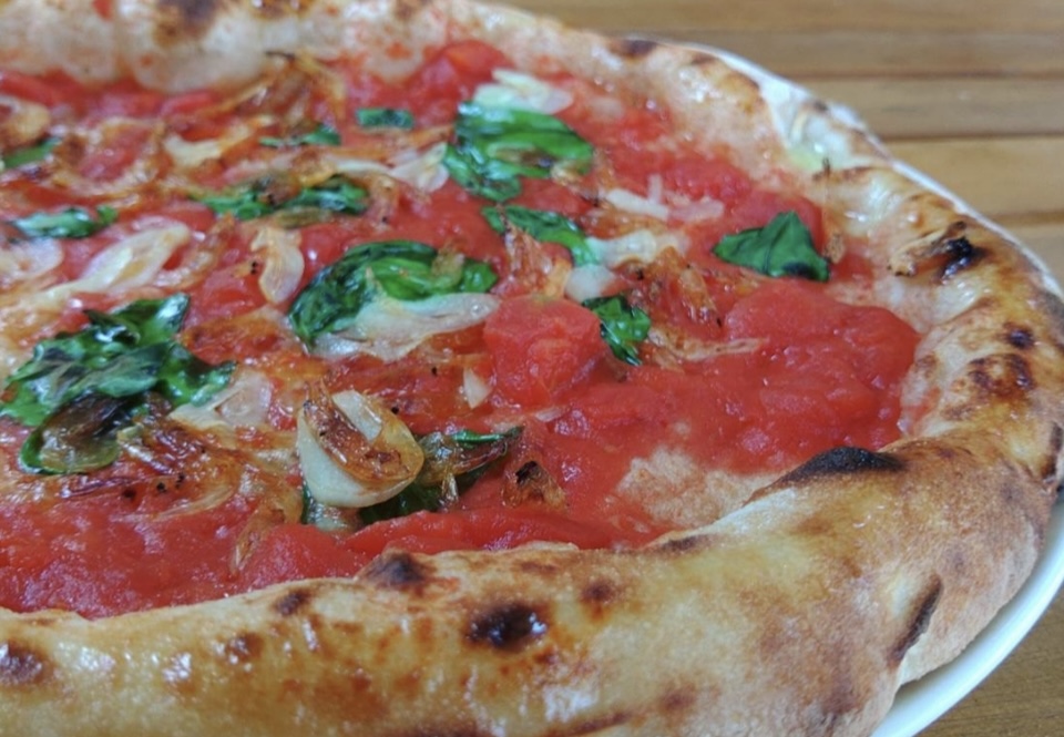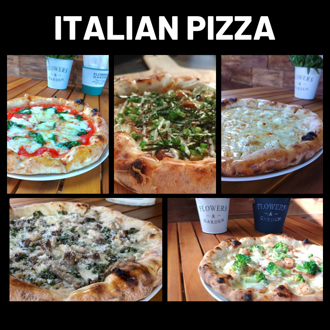 厳選したイタリア産と日本の小麦粉をブレンドしたこだわりの生地。その日の気温、湿度を見極め加水や練り時間を調整。一枚一枚その日の生地の状態に合わせて手伸ばしし、高温で一気に90秒で焼き上げます。
