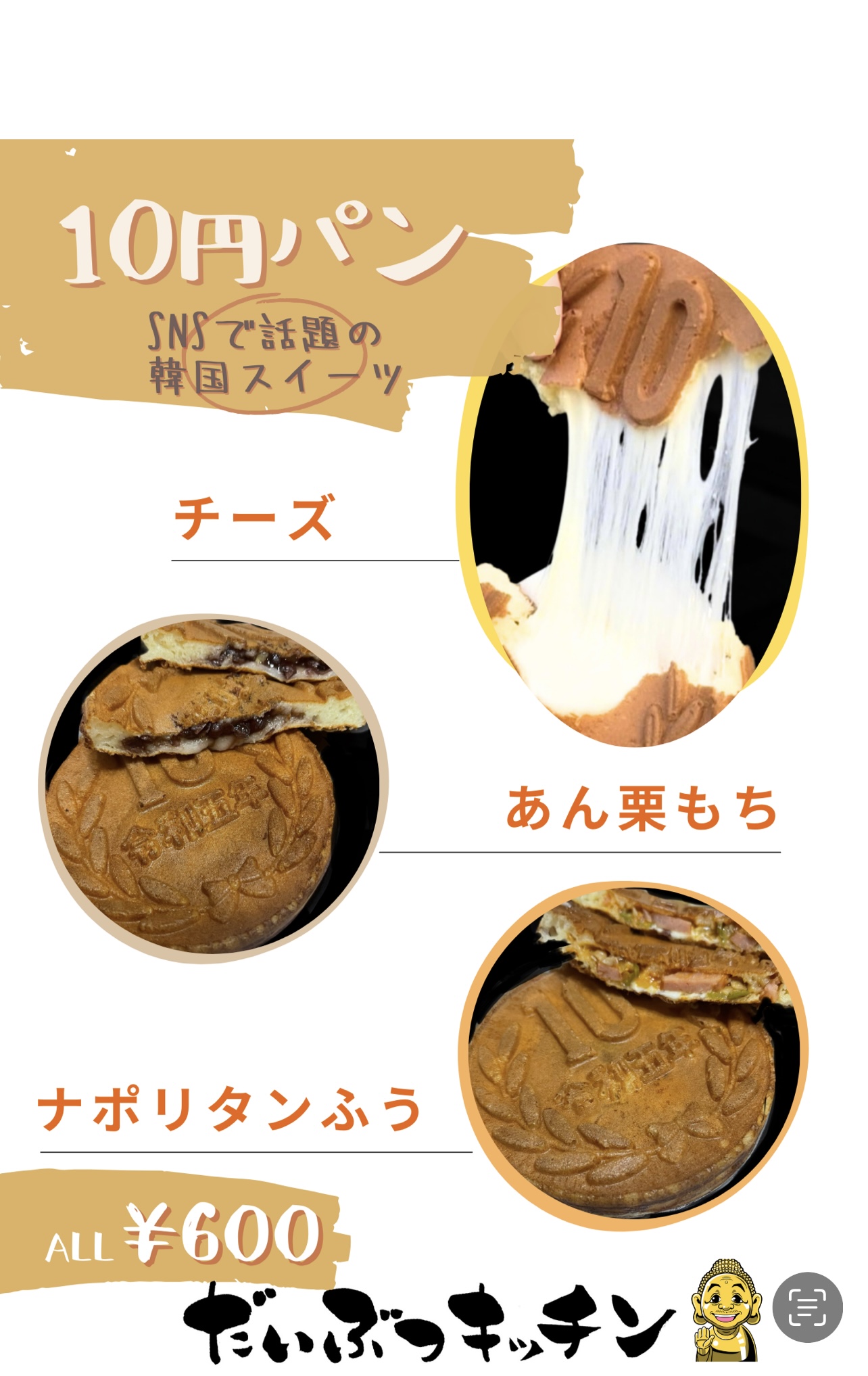 10円パン、室蘭やきとり、いちごミルク、メロンミルク、生ビール、揚げ物