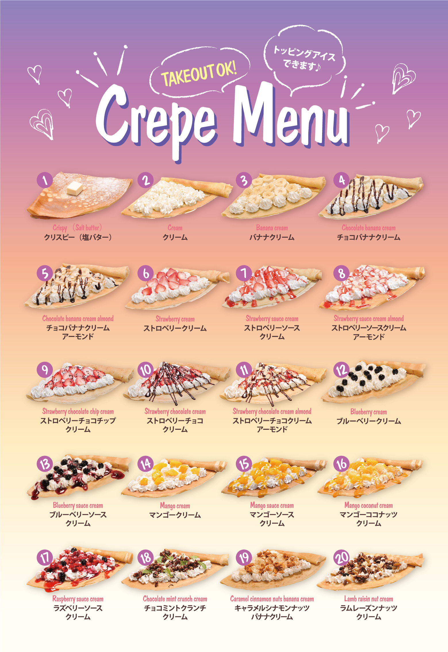 焼きたてもっちり生地に濃厚ホイップクリーム、イチゴやバナナのほかにクリスピー塩バターやチョコミントなどバリエーション豊かな20種類のメニューをご用意!