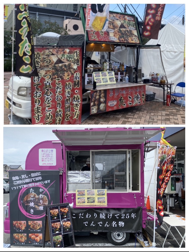 城野駅前にある居酒屋でんでんと同じメニューが提供出来ます。変わり種たこ焼きをメインに唐揚げ、おでん、焼きそば、かき氷など季節に応じてメニューを変えることが出来ます。