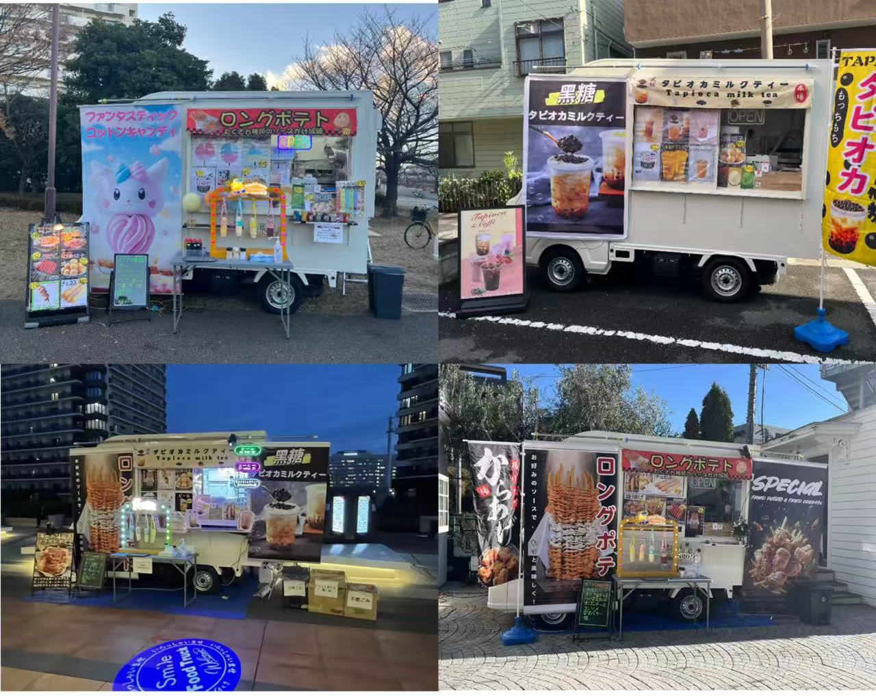 揚げもの(唐揚げ、フライドポテト、ロングポテト、チュロス、チュロドッグ、ゴマ団子、オリジナルミートソースポテトなど))、チーズハットグ、ジャンボフランク、アメリカンドッグ、かき氷、アイスクリーム、ドリンク(タピオカミルクティー、タピオカ抹茶ミルク、タピオカイチゴミル、タピオカチョコレートミルク、コーヒ)カラフル綿あめ、アルコール(ビール、サワー、ハイボールなど))