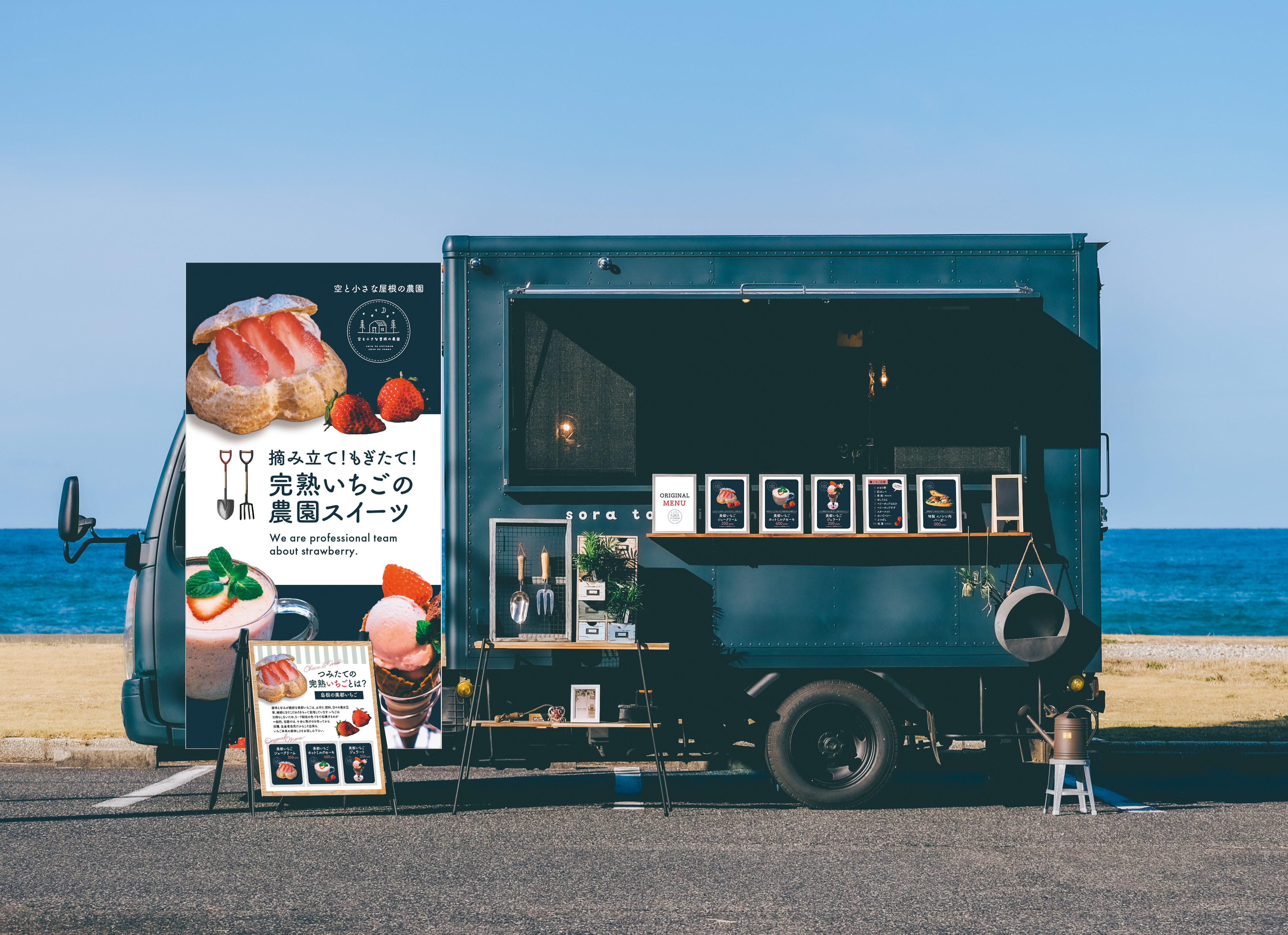 いちご農家が手がけるキッチンカー = その時一番おいしい品種を完熟もぎたてで提供できるということ。時期によっては、お好みの品種を選んでいただくこともできますよ。農家としてキッチンカーを営業するからこそ、届けたいちょっと贅沢な非日常です。