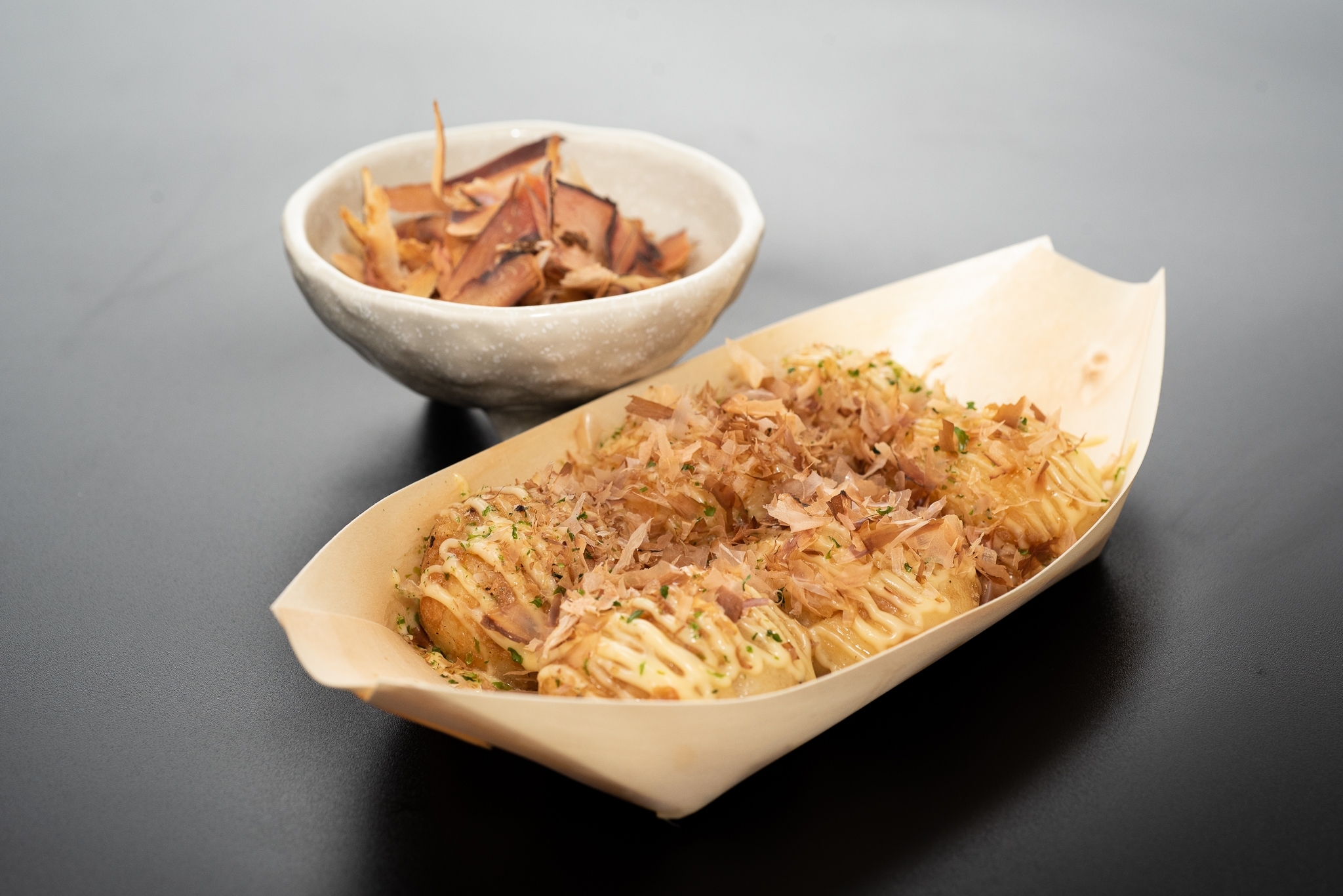 ミックス粉は使用せず、国産小麦粉を使用し高級お出汁をふんだんに使い材料全てにこだわり、職人が銅板で一気に焼き上げる最高峰のたこ焼きです。口に入れる前から出汁が香り、一度食べたら忘れられないまさに恋するたこ焼き。
