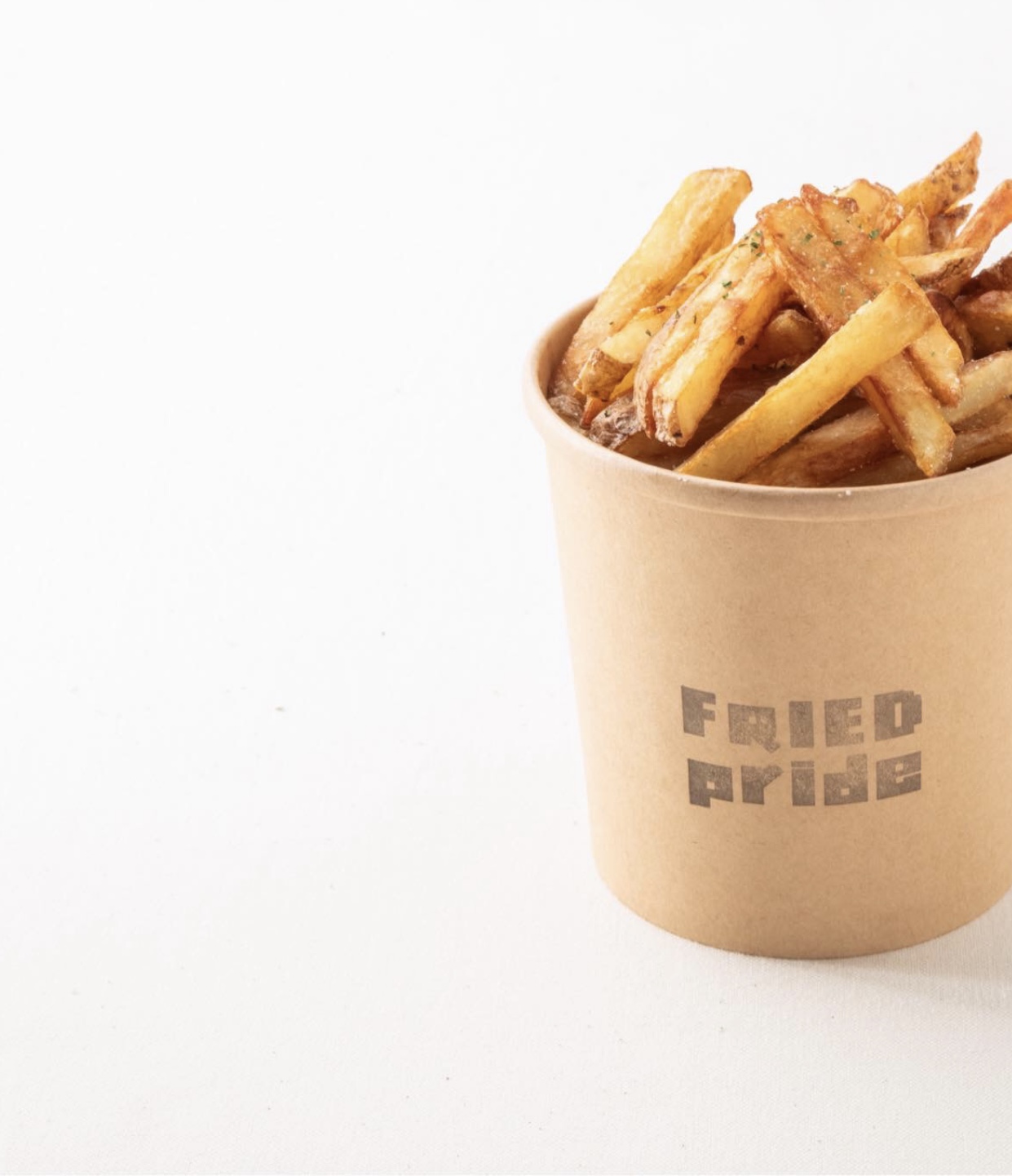 黄色いアメリカンスクールバスがトレードマークのフレンチフライ専門店【FRIED pride】です。国内各地のお世話になっている農家さんから直接送っていただいたフレンチフライ専用品種の生じゃがいもをその場でカット。じゃがいもの特徴や糖度などによって揚げ時間や温度を変えてフレンチフライにしています。
