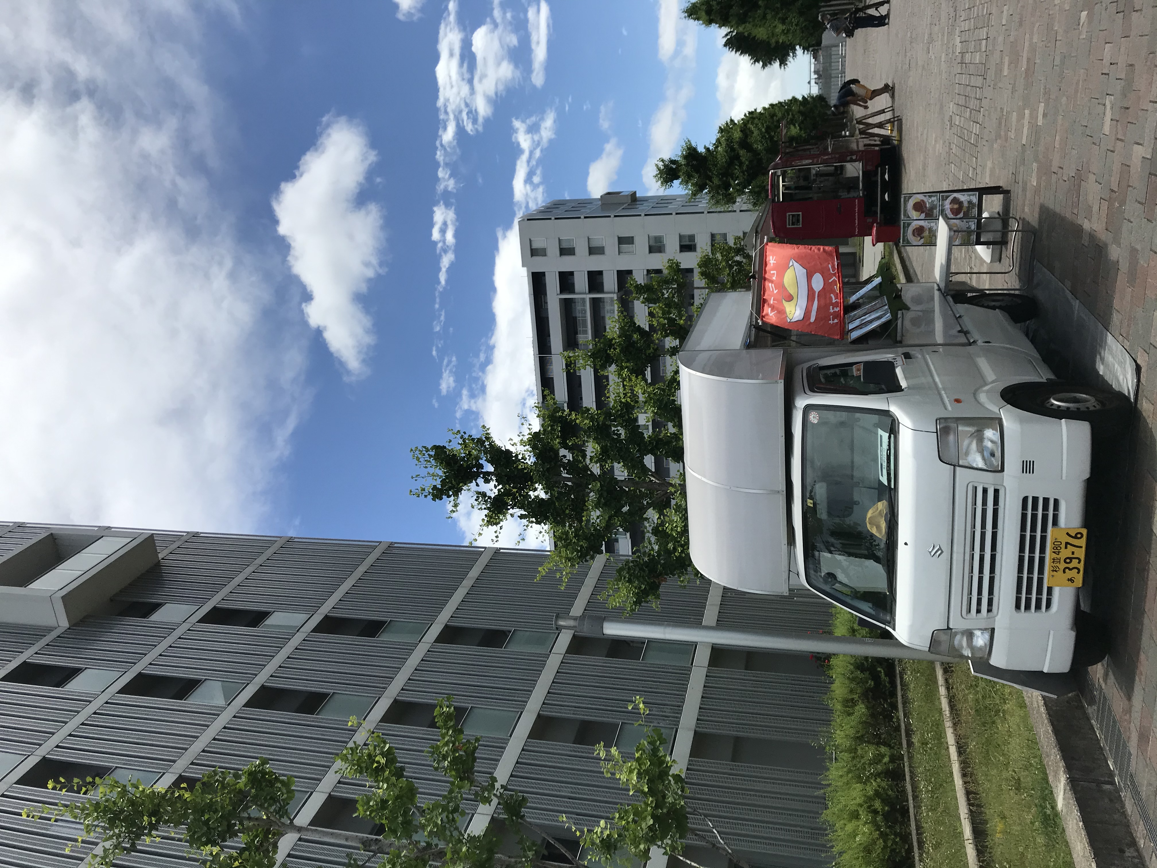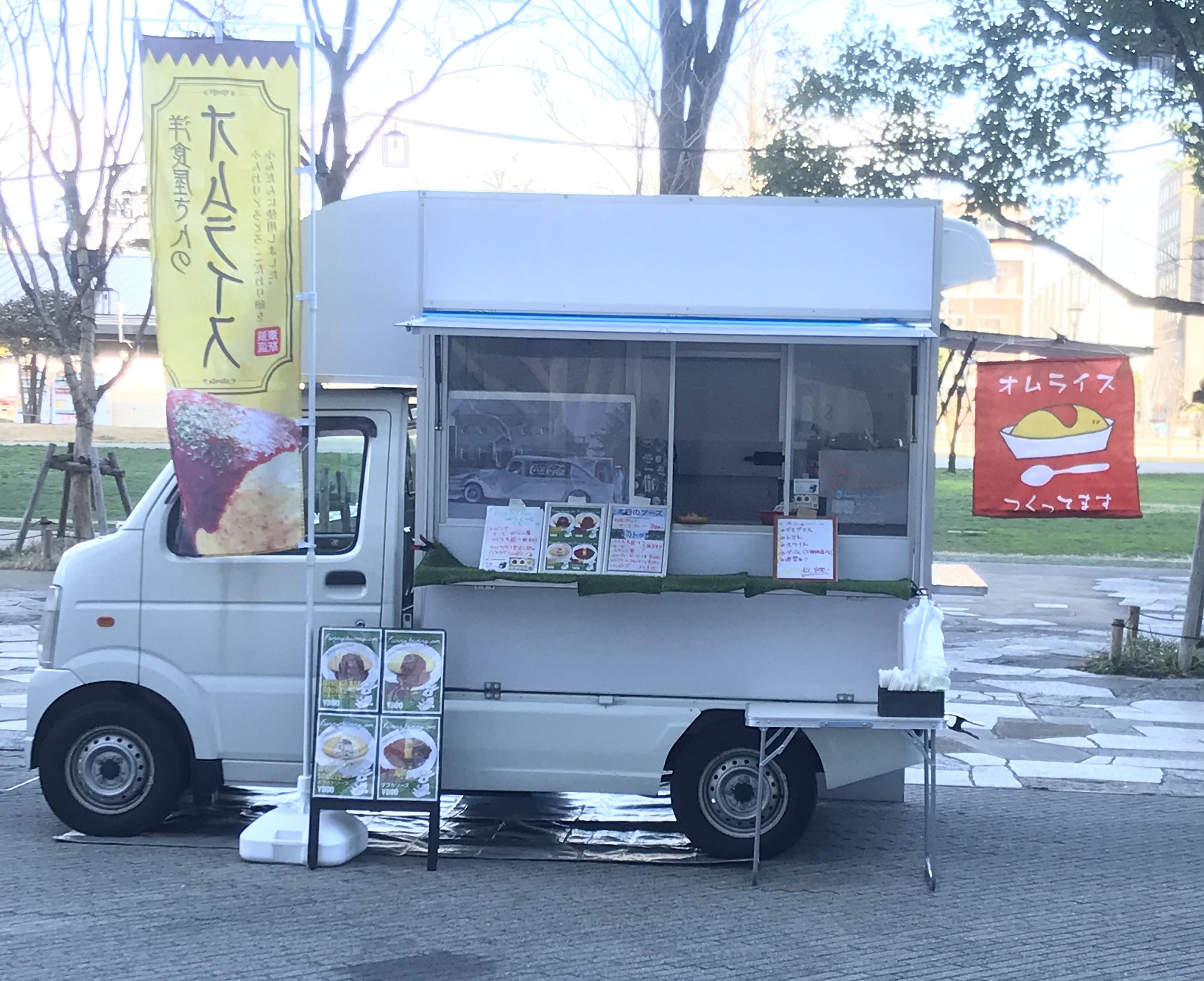軽トラックベースのキッチンカーなので最小限のスペースで出店でき、販売口もサイドとバックにもあるので色々な場所に対応できます。またカラーも白で飾り付けも控えめになってるので景観も損ないません。