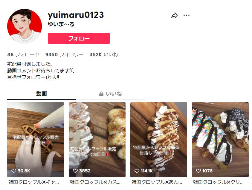 Tiktokにて「宅配員からワッフル販売目指して〇〇日」というタイトルで動画を投稿していたところなんと思いもよらぬほどの反響がありました!