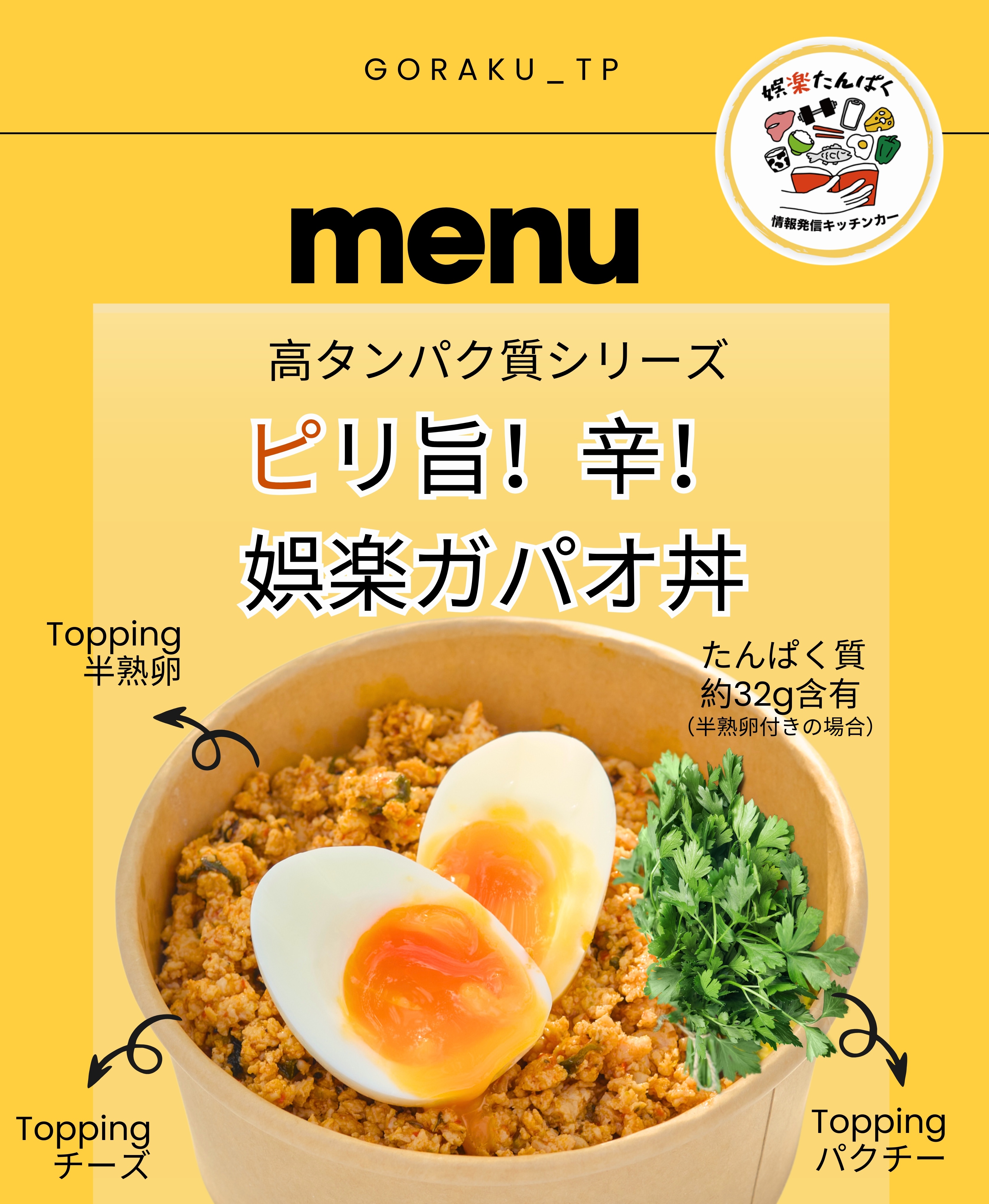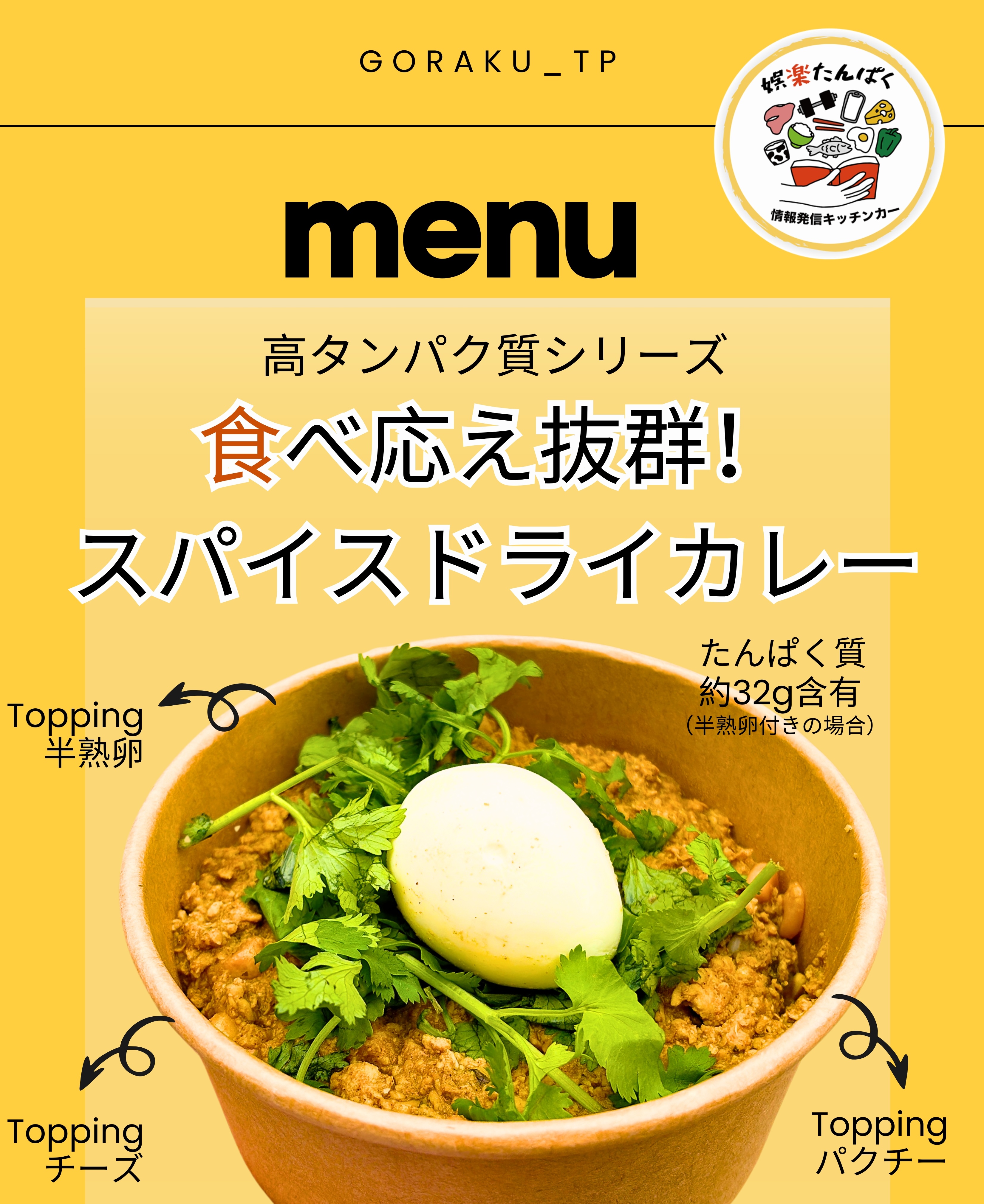オリジナルの「ピリ旨!辛!娯楽ガパオ」や「スパイス香るドライカレー」など、タンパク質が摂れるメニューを提供する際は、国産鶏むね肉で柔らかく仕込んだ自家製ミンチをベースに、約30g以上のタンパク質が摂れるように作っています。ランチ提供であれば、出来立てのふわとろ卵丼も可。味は決して淡白ではなく、毎日でも食べたいしっかりとしたお味に仕上げているのがポイントです。