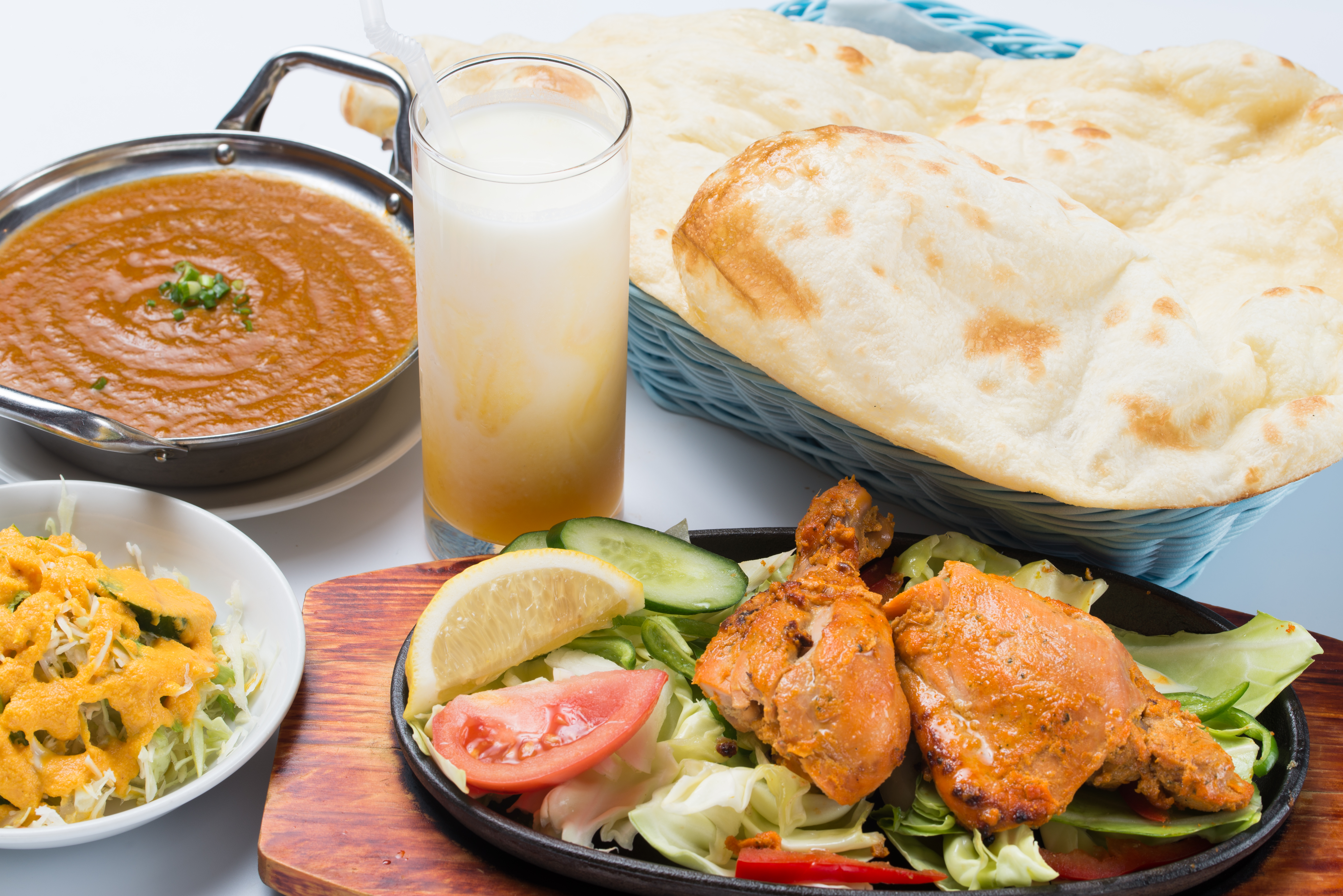 インドカレー、チーズナン、タンドリーチキン、焼きそば、サモサ、ドリンク