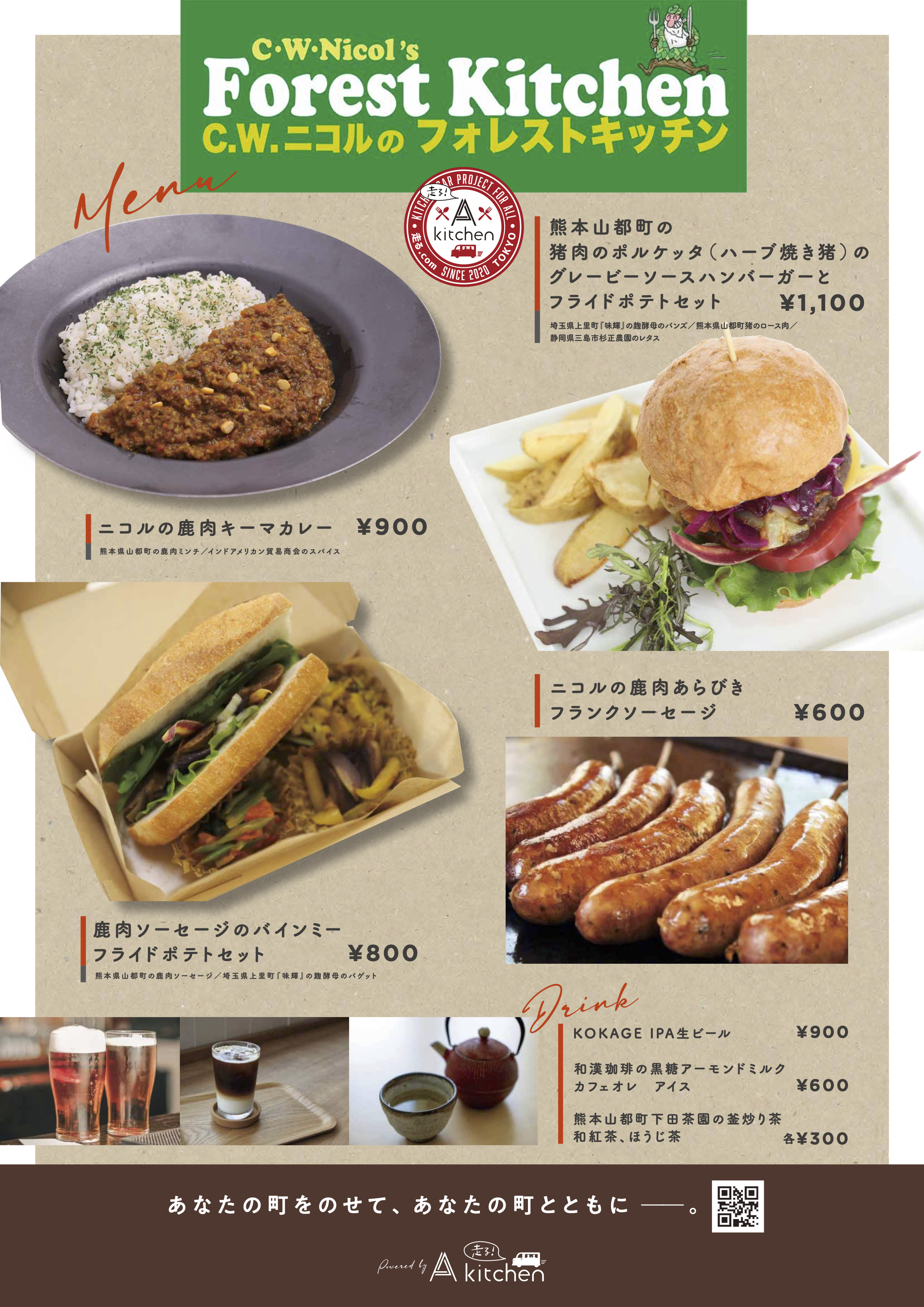 CWニコルさんと10年間継続してきた ニコルズフォレストキッチン 森の資源の有効活用を身近な場面で手軽に召し上がっていただける機会を作り続けてきました。 キッチンカーのメニューとして馴染みやすい鹿肉のキーマカレーや、猪の欧風香草焼きのハンバーガーなどメニューとしてご用意しています。