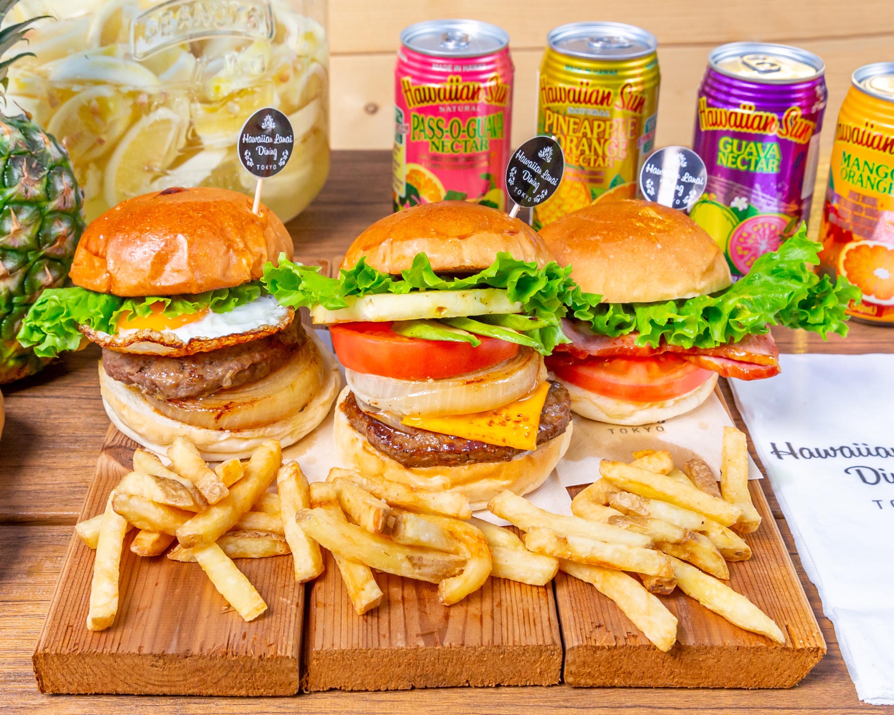 ハワイ料理 自家製無添加バンズを使用したハンバーガー ガーリックシュリンプ 自家製無添加フライドポテト モチコチキン(ハワイの唐揚げ) ロコモコ KONAビール(ハワイ定番ビール)、ハワイアンサン(ハワイ定番のネクタージュース)、ハワイアンレモネード、等