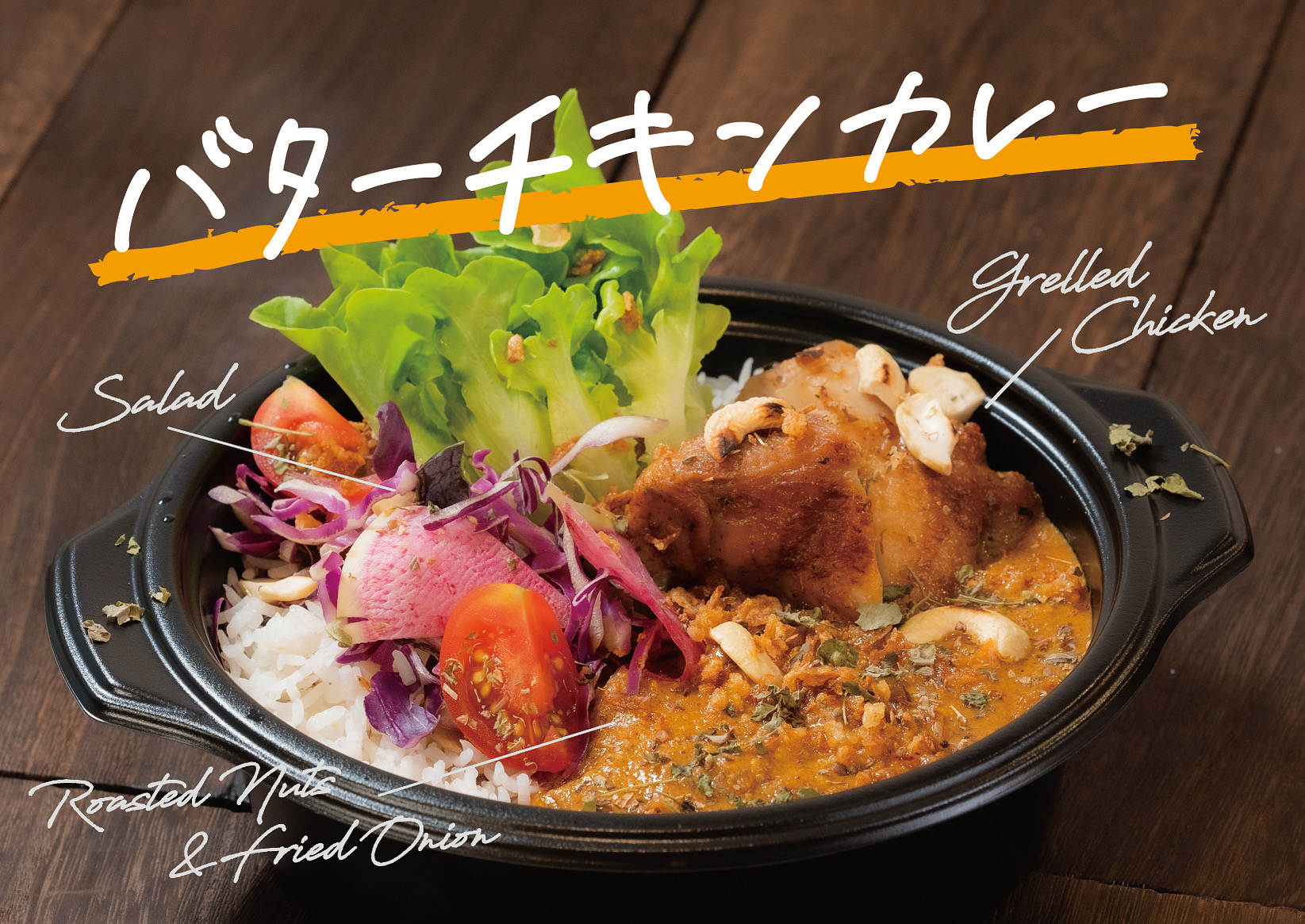 バターチキンカレー屋です。ご飯に合うバターチキンはなんなのかと試行錯誤した、渾身のバターチキンカレーに、外はカリッと中はジュワッと仕上げたグリルチキンをたっぷり絡めて召し上がれ!