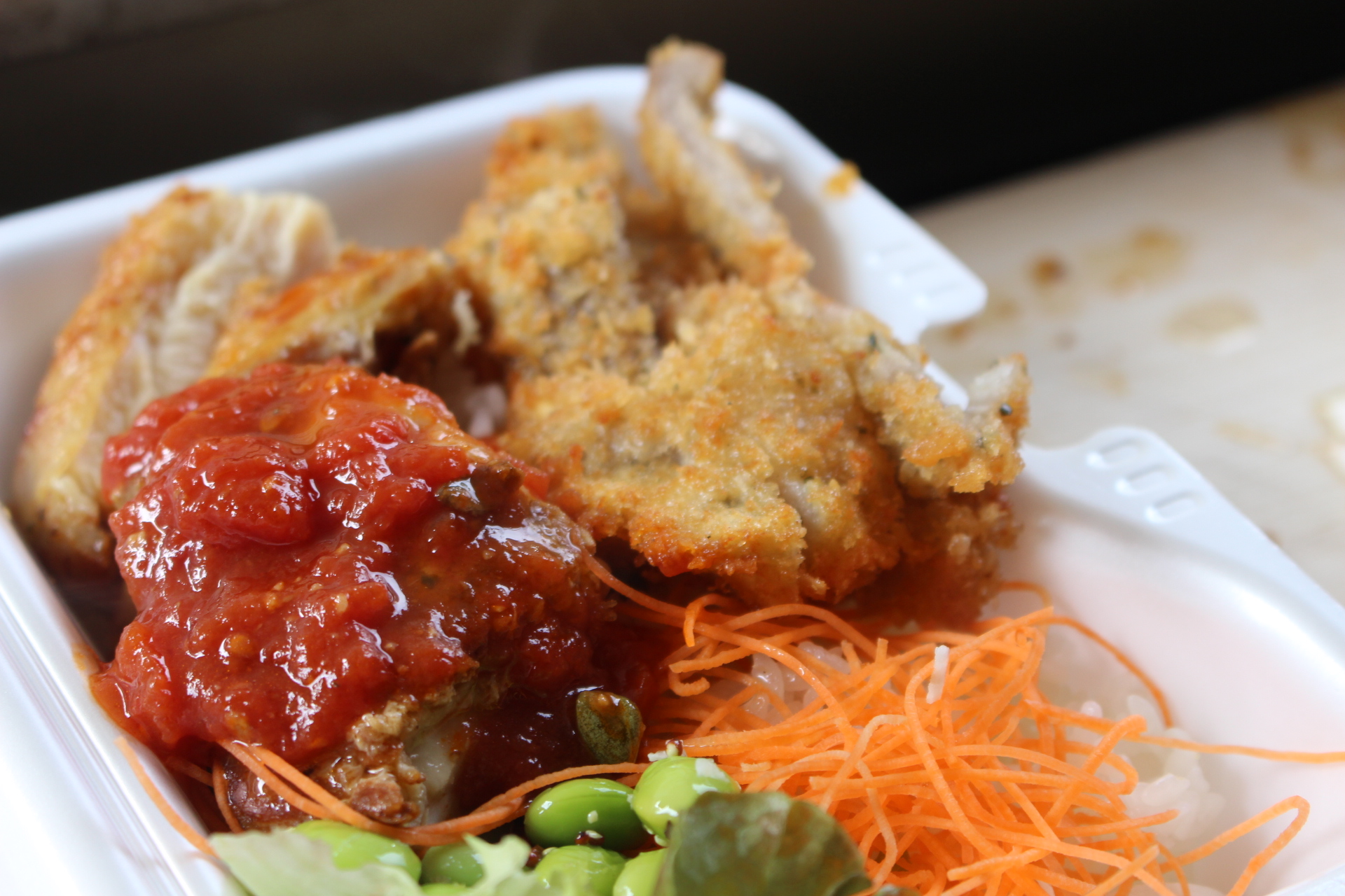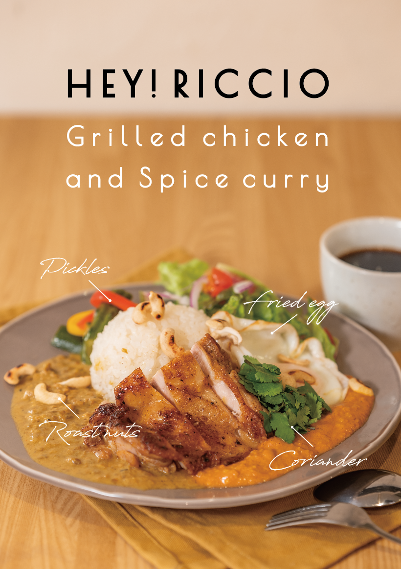 Hey!Riccio一番の人気メニューは「グリルチキンとあいがけカレー」元イタリアンシェフの川名さん自信の味付けの、外はカリッと中はジュワッと仕上げたグリルチキンに、Hi, spice監修の味噌を使用したカレーを絡めて召し上がれ〜!