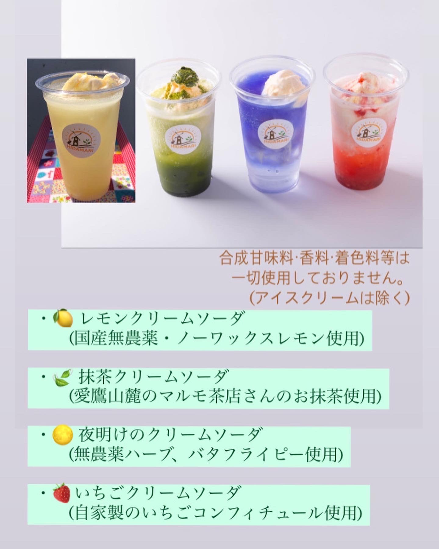 クラフトドリンクの・レモンスカッシュ・レモネード、ジンジャーエール・クラフトコーラは農家さんからの無農薬素材を取り寄せて作ります。クリームソーダたちも合成甘味料、香料、着色料は不使用の安心安全素材を大切にしている唯一無二のドリンク達です。