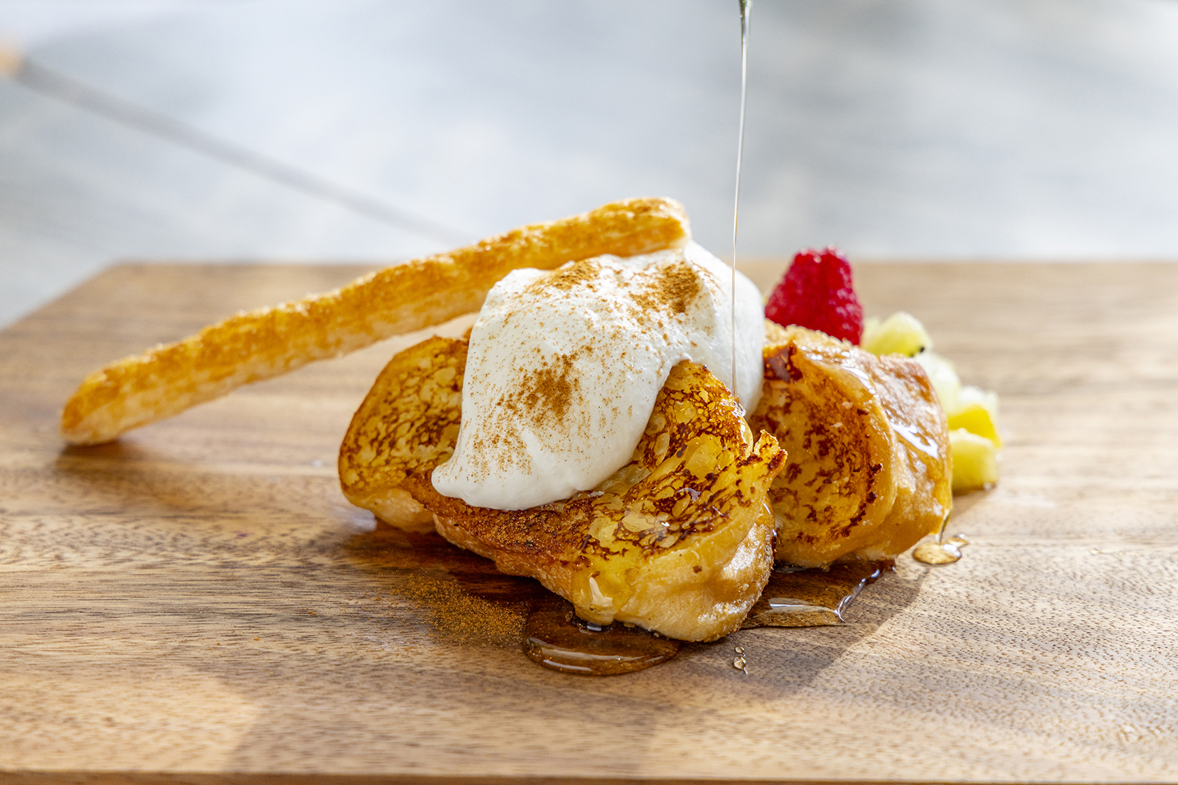 ヒルトン成田テラス レストランの大人気メニュー「テラス特製フレンチトースト」がキッチンカーで登場! 卵液にじっくり漬けこんだバケットを外はカリカリ、中はふわふわに焼き上げます。