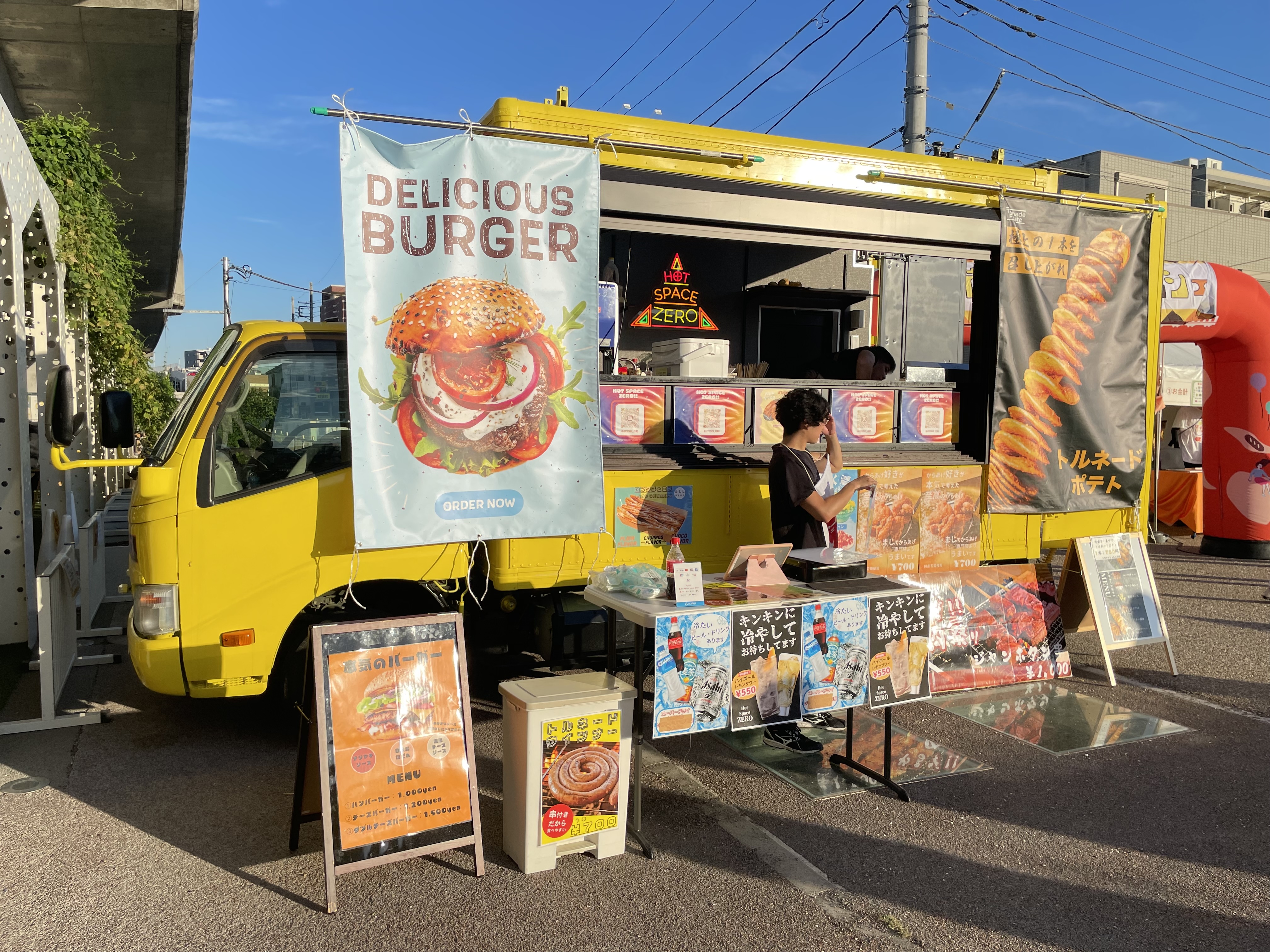 トルネードポテト、丼もの、ハンバーガー、チヂミ、ヤンニョムチキン、唐揚げ、焼きそば、牛串、タン串、かき氷、タコライス、ホットサンド、ソフトドリンク、アルコール
